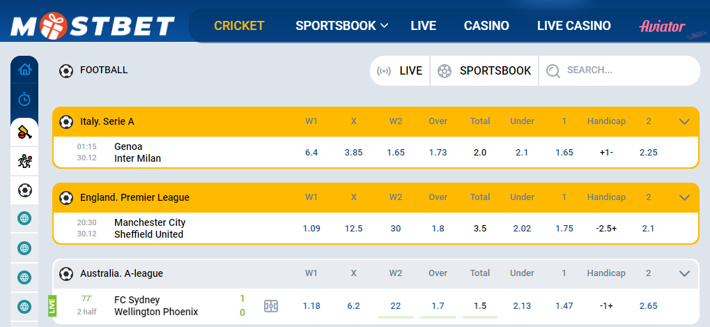 A wide range of sports are included in the Mostbet sportsbook, with top picks such as cricket, football, and field hockey right through to global sports including chariot racing, Gaelic football, and beach soccer.