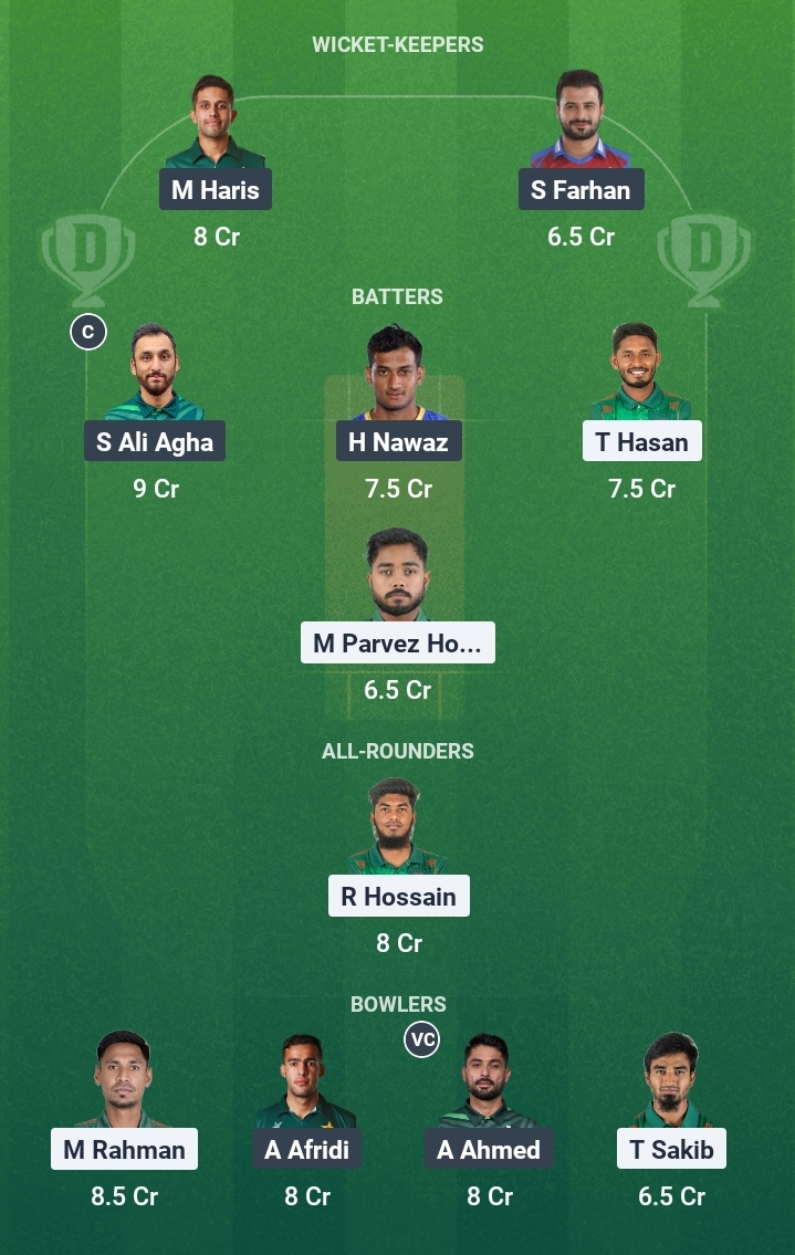 Sahibzada Farhan, Saim Ayub, Mohammad Haris (wk), Hasan Nawaz, Salman Agha (c), Mohammad Nawaz, Khushdil Shah, Faheem Ashraf, Abbas Afridi, Sufiyan Muqeem, Abrar Ahmed