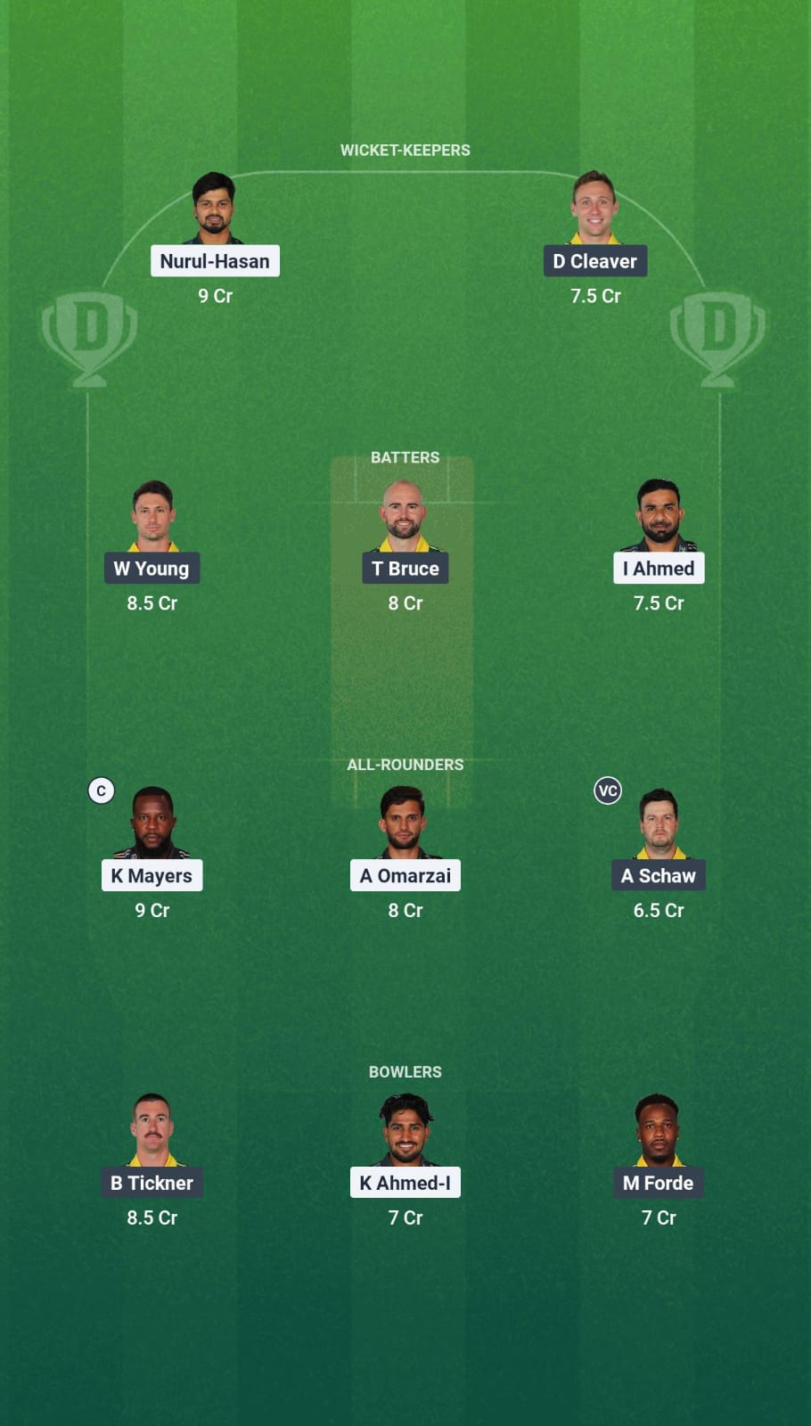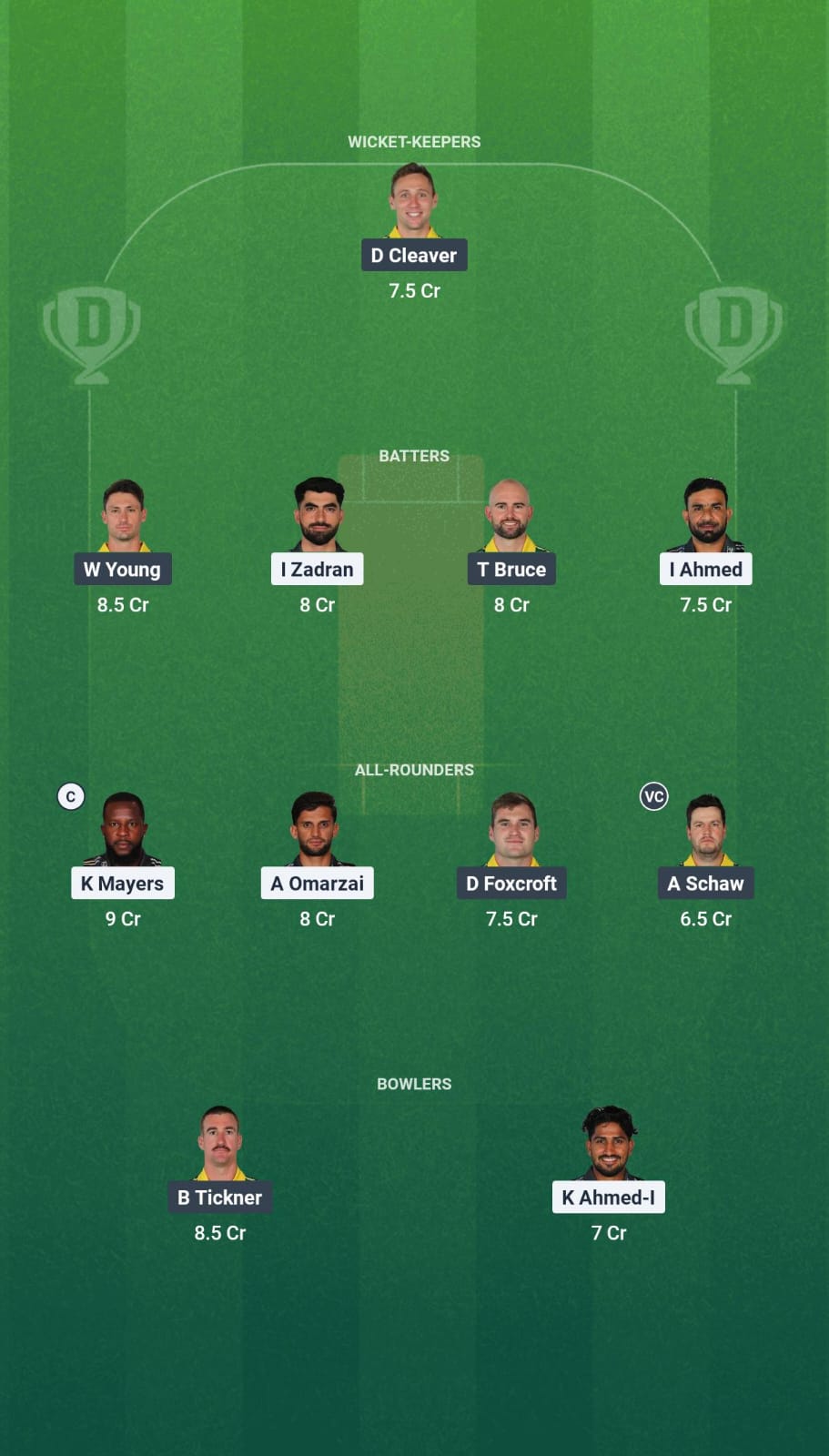 Both teams are home to some good all-rounders. We are selecting Kyle Mayers, Azmatullah Omarzai, Dean Foxcroft, and Angus Schaw here.