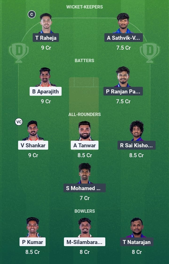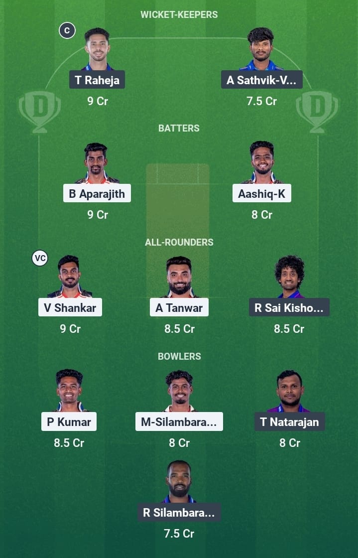 K Aashiq, Mokit Hariharan, Baba Aparajith (c), Vijay Shankar, Narayan Jagadeesan (wk), Swapnil Singh, S Dinesh Raj, Abhishek Tanwar, J Prem Kumar, M Silambarasan, Rohith Suthar
