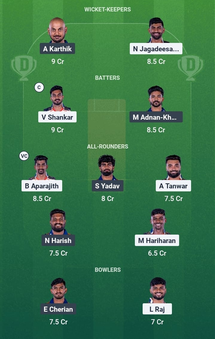K Aashiq, Mokit Hariharan, Baba Aparajith (c), Vijay Shankar, Abhishek Tanwar, S Dinesh Raj, Narayan Jagadeesan (wk), Swapnil Singh, M Silambarasan, Lokesh Raj, Sunil Krishna