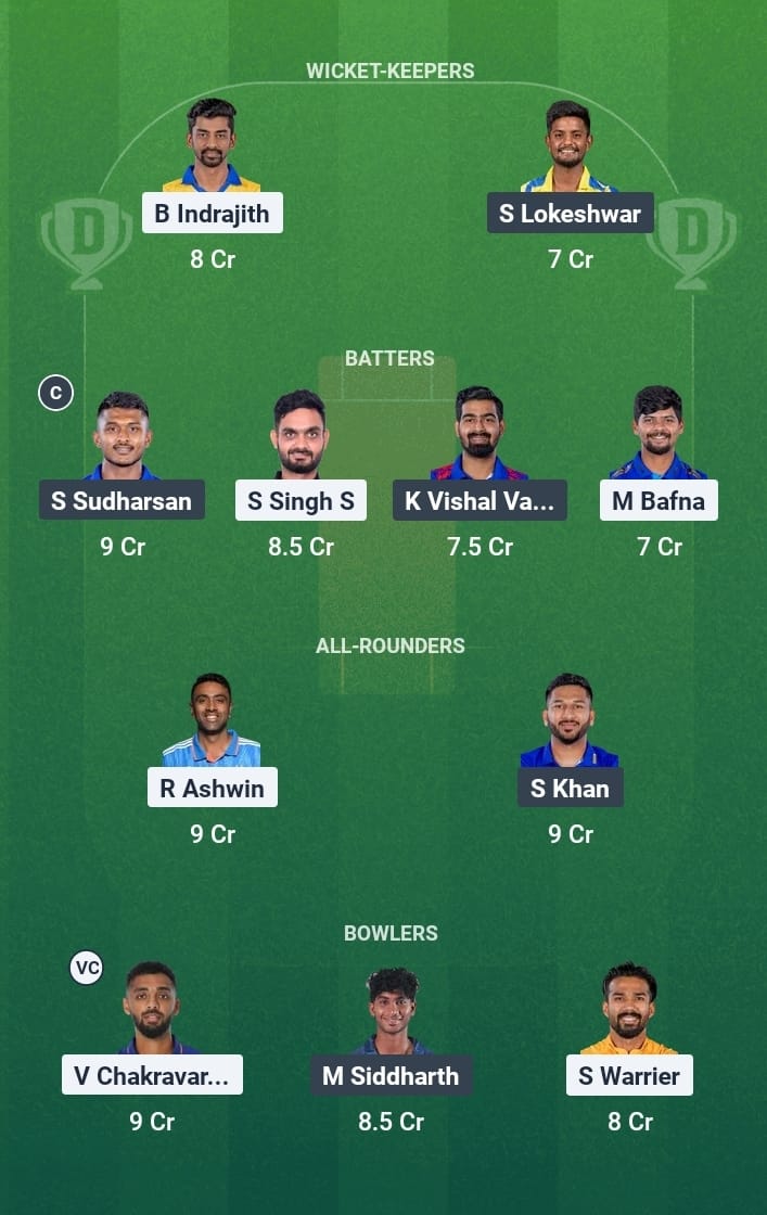 Vimal Khumar, Shivam Singh, RK Jayant, Ravichandran Ashwin (c), Baba Indrajith (wk), Maan Bafna, M Karthik Saran, Varun Chakravarthy, Ganeshan Periyaswamy, Sandeep Warrier, M Viju Arul