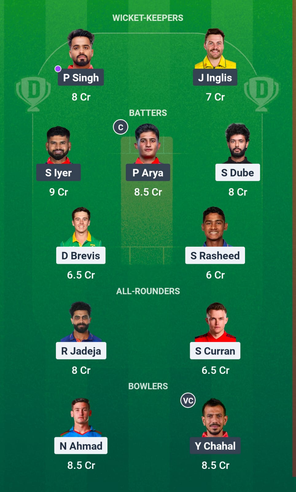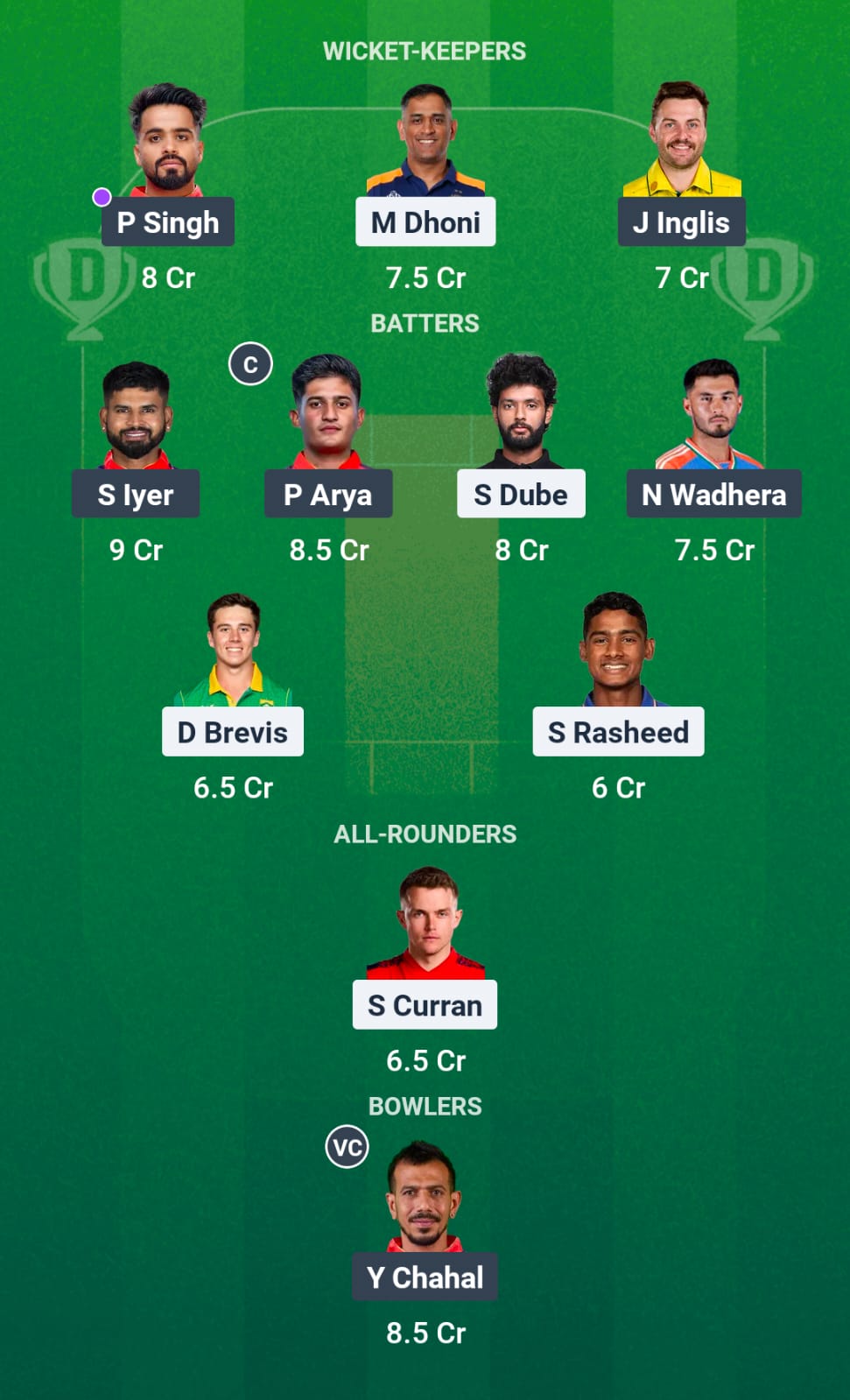 Priyansh Arya, Prabhsimran Singh, Shreyas Iyer (C), Josh Inglis (WK), Shashank Singh, Glenn Maxwell, Azmatullah Omarzai, Yuzvendra Chahal, Marco Jansen, Arshdeep Singh, Nehal Wadhera