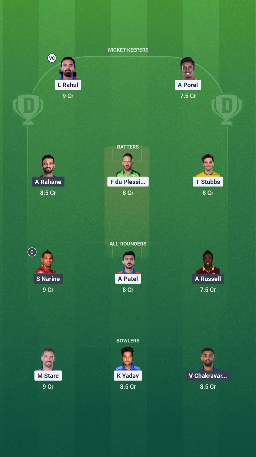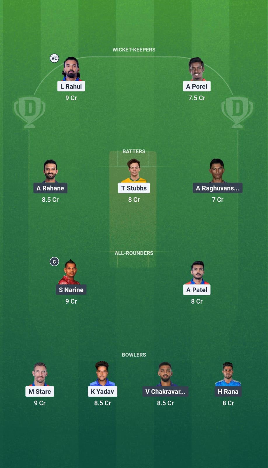 The bowlers are likely to play an important part in this match. Varun Chakravarthy, Mitchell Starc, and Kuldeep Yadav are no-brainers for us. We are also going with Harshit Rana.
