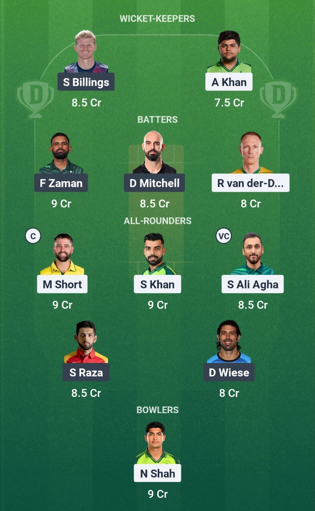 We think the bulk of the points are going to come from this section of the players. Matt Short, Shadab Khan, Salman Ali Agha, Sikandar Raza, and David Wiese are all expected to play a central role in the match. We think Short is going to be relatively lower owned and could end up being a differentiator for you.