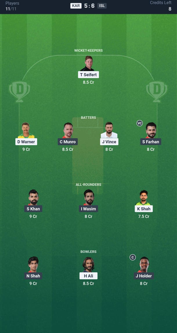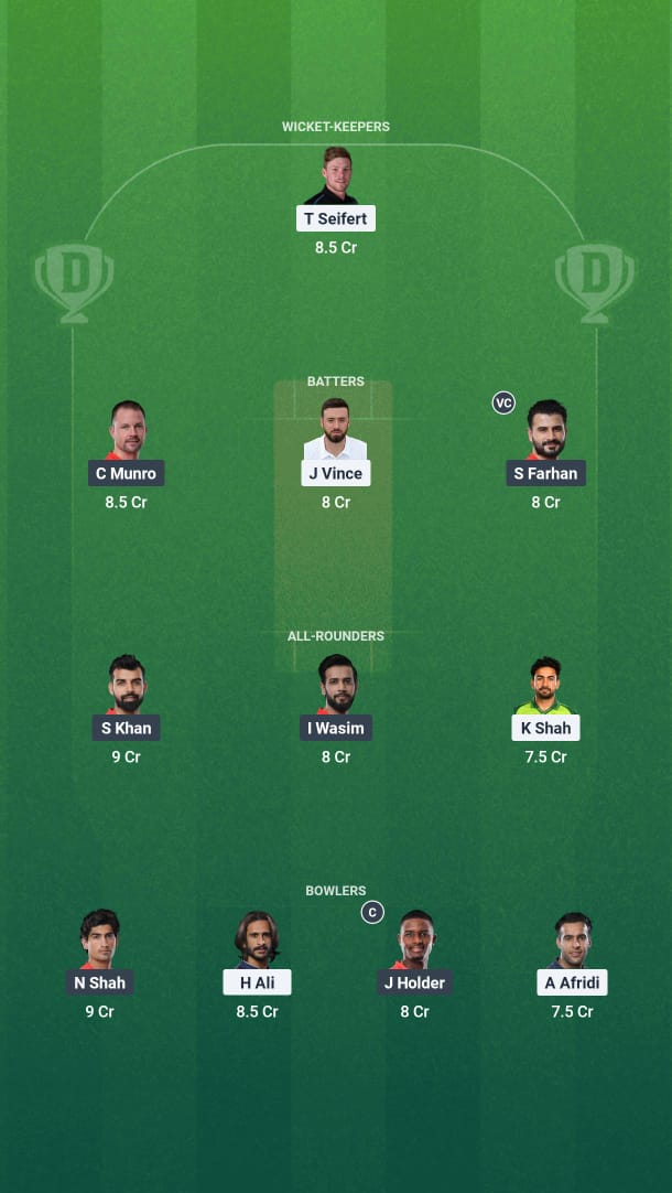 Both teams have some brilliant batsmen who are in good form. Colin Munro, Sahibzada Farhan, and James Vince are the top three run-getters of the tournament. We are also selecting David Warner given his experience in the shortest format.