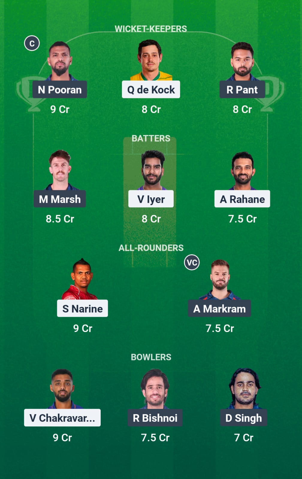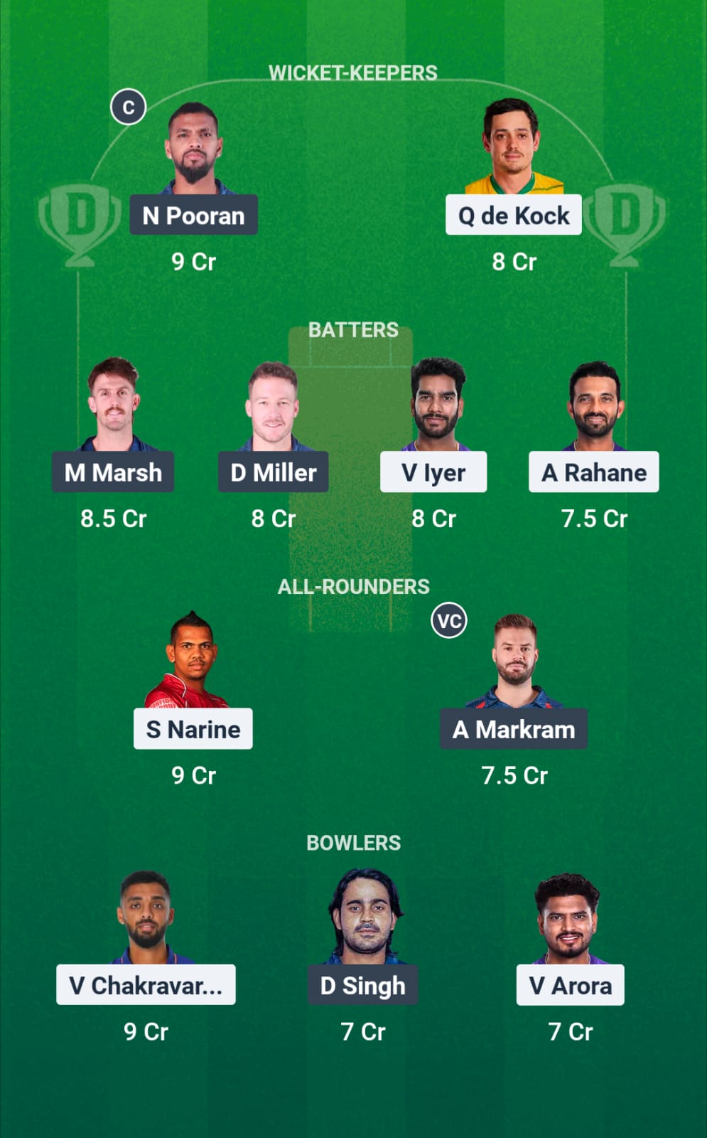 Aiden Markram is the standout batter in this group while Sunil Narine is the most effective bowler. We suggest picking both in the lineup especially as Narine can contribute with the bat also.
