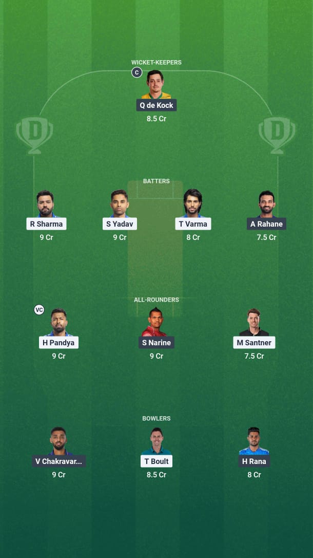 Quinton de Kock (WK), Sunil Narine, Venkatesh Iyer, Ajinkya Rahane ©, Andre Russell, Ramandeep Singh, Rinku Singh, Spencer Johnson, Varun Chakravarthy, Harshit Rana, Vaibhav Arora