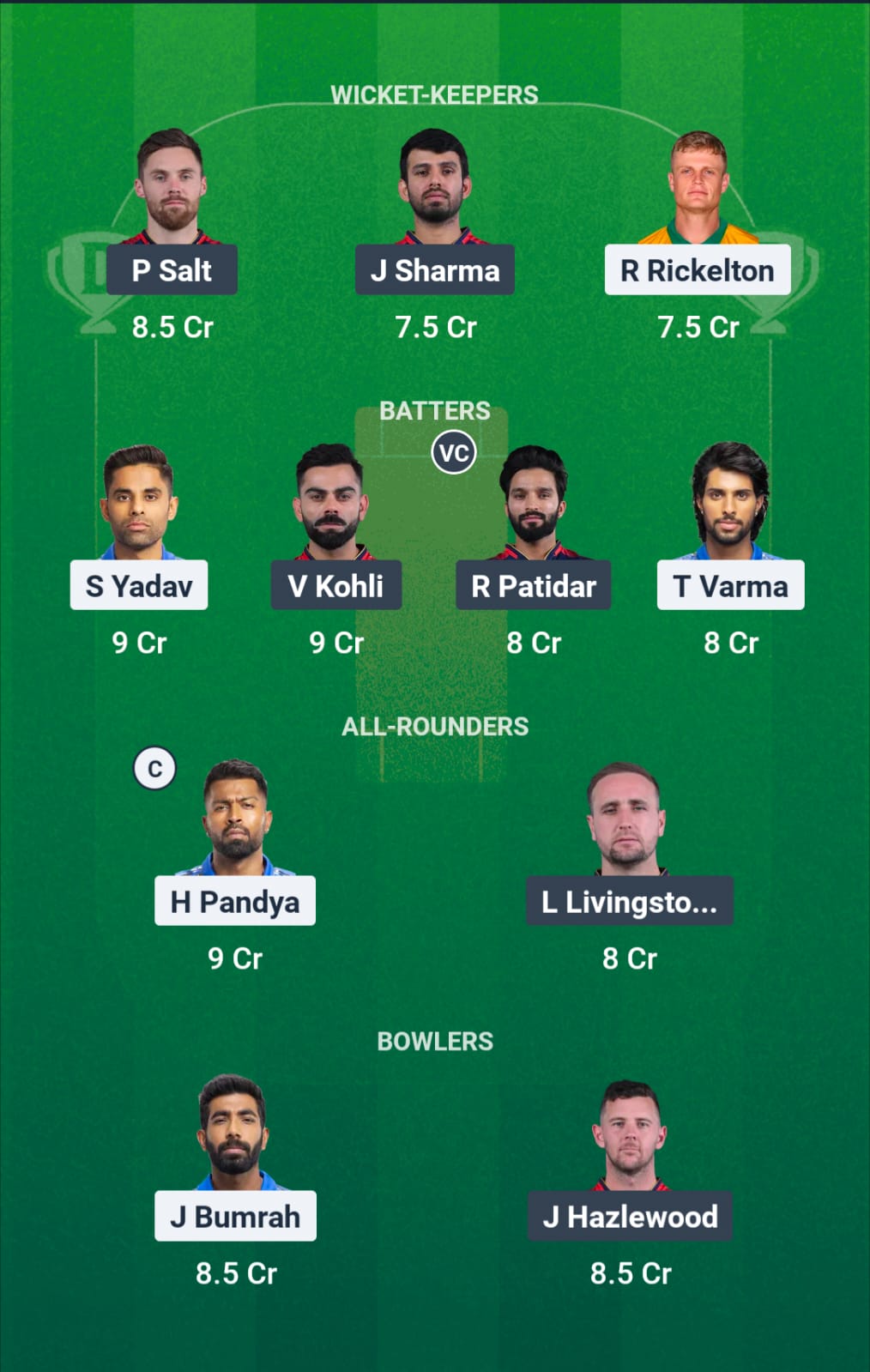 Phil Salt (WK), Virat Kohli, Devdutt Padikkal, Rajat Patidar (C), Liam Livingstone, Jitesh Sharma, Krunal Pandya, Tim David, Josh Hazlewood, Bhuvaneshwar Kumar, Yash Dayal