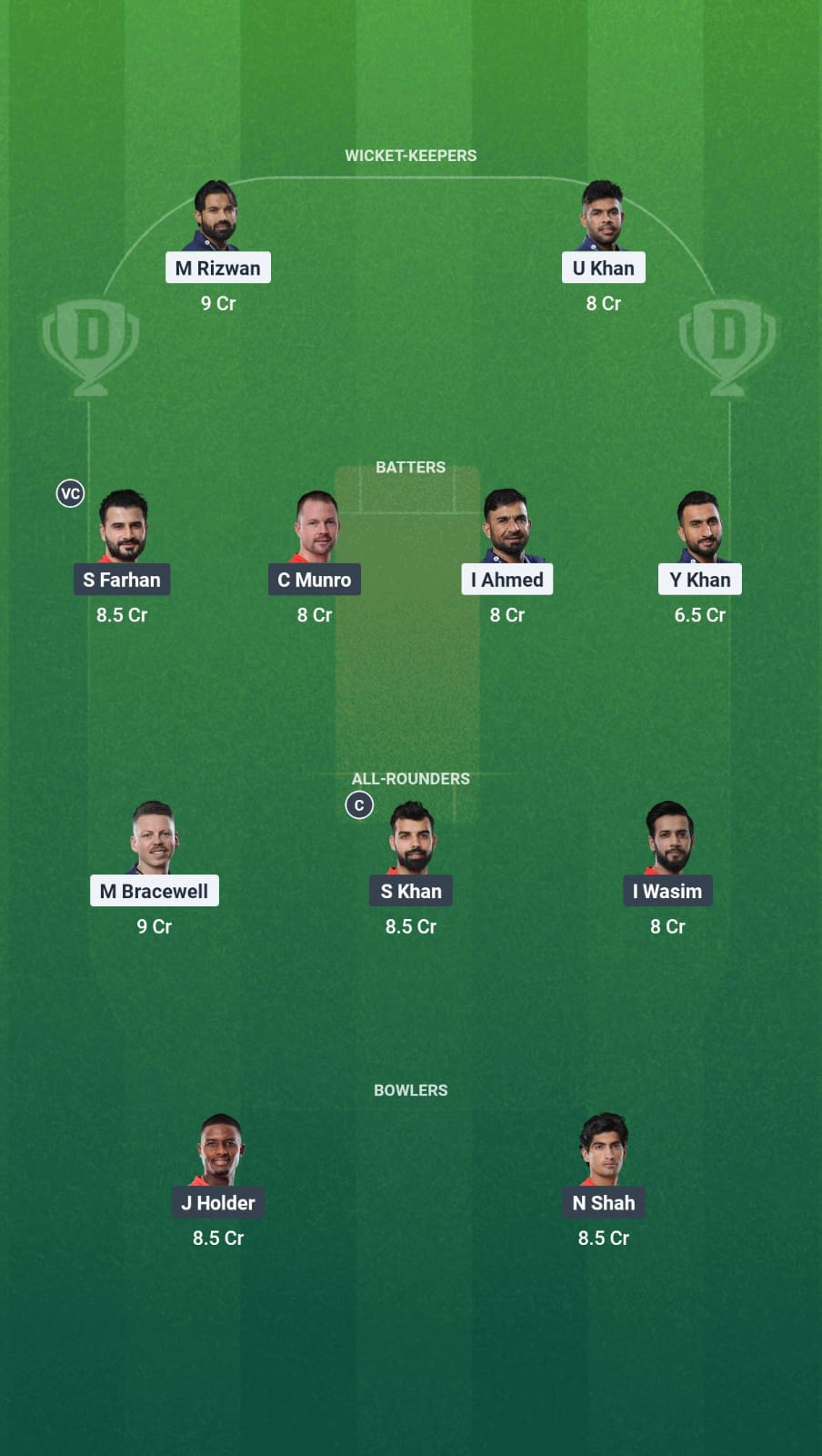 Sahibzada Farhan, Azam Khan (WK), Colin Munro, Haider Ali, Shadab Khan (C), Imad Wasim, Mohammad Nawaz, Muhammad Shahzad, Jason Holder, Naseem Shah, Ben Dwarshuis