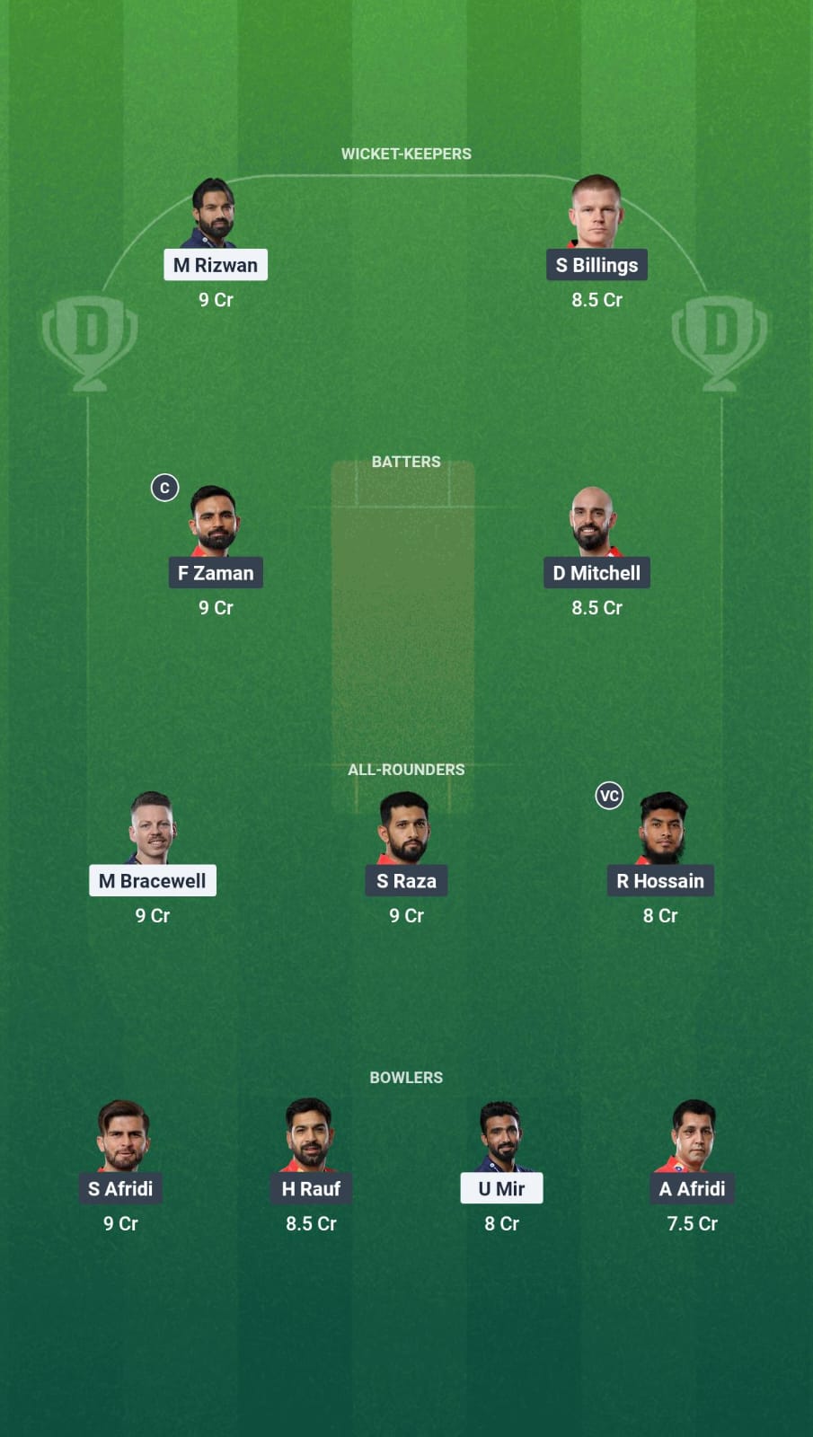Fakhar Zaman, Mohammad Naeem, Abdullah Shafique, Daryl Mitchell, Sikandar Raza, Sam Billings (WK), Shaheen Shah Afridi (C), Rishad Hossain, Haris Rauf, Asif Afridi, Zaman Khan