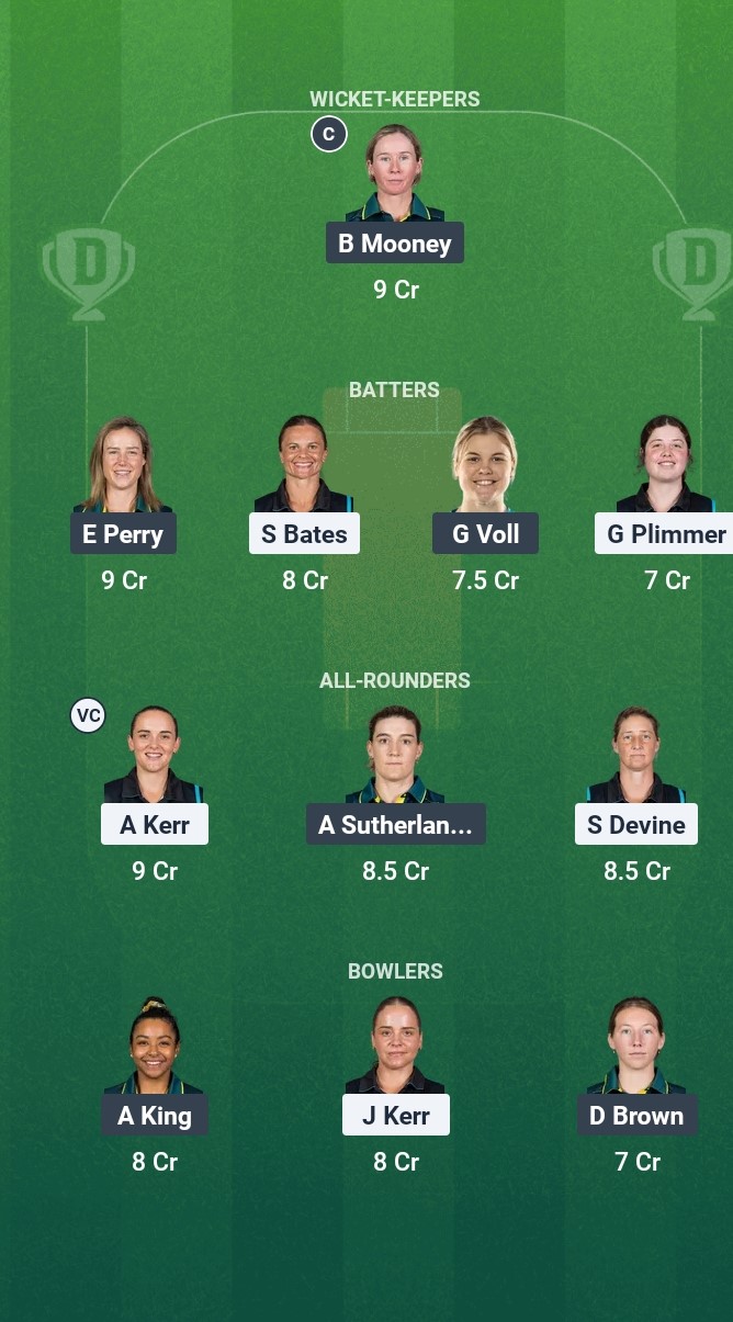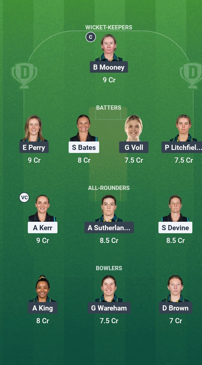 The top choices for batters in this game will include Georgia Voll, Beth Mooney, G Plimmer, and Ellyse Perry. As you can see, most of these batters are from the Australian team. They have played far better cricket than their New Zealand counterparts.