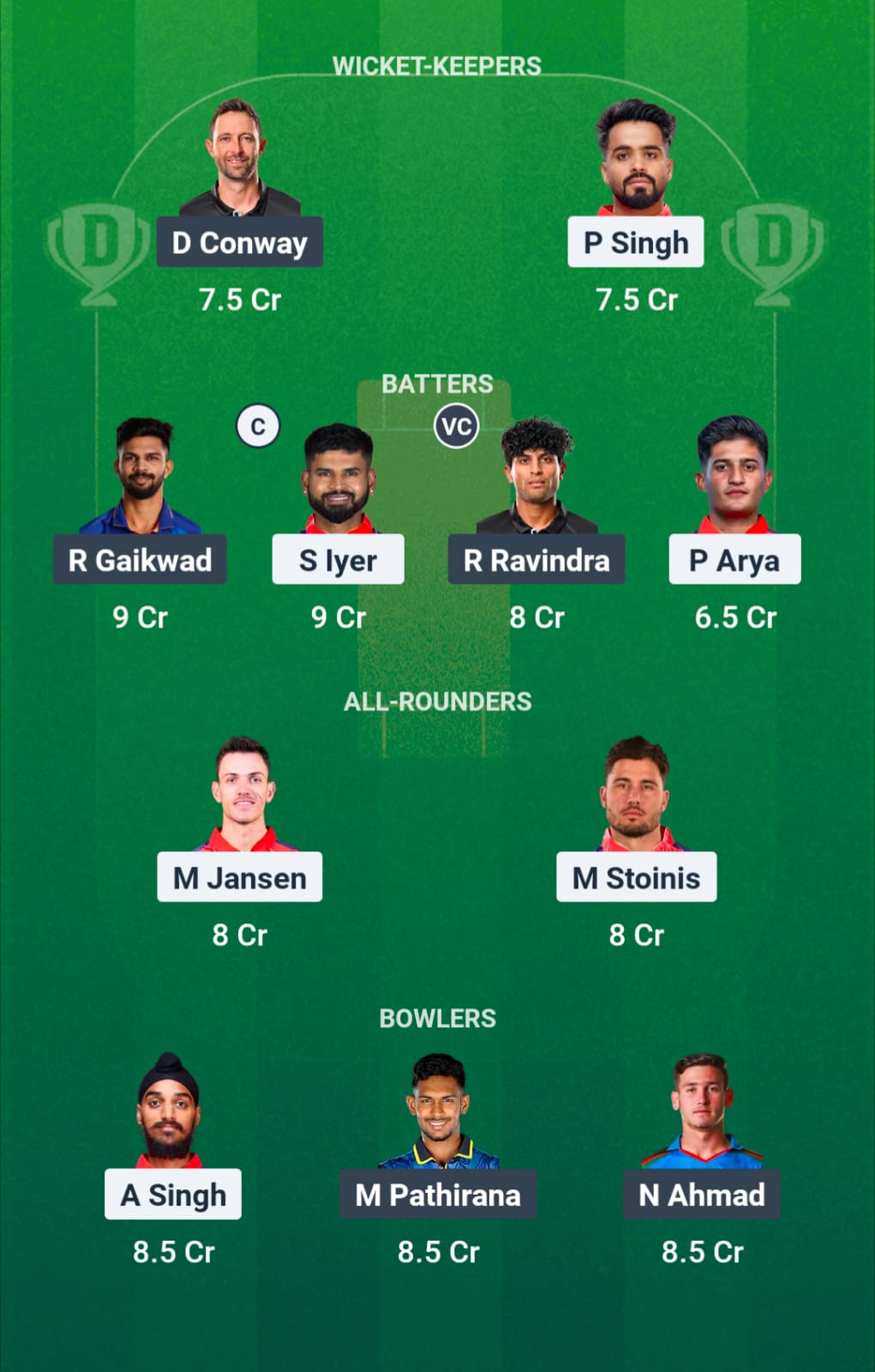 Two left-arm bowlers could be the best choices in your lineup. Both Noor Ahmad and Arshdeep Singh have taken an average of two wickets or more per game this IPL. Wrist-spinner Ahmad took three wickets against Bangalore and pacer Singh took three wickets against Lucknow.