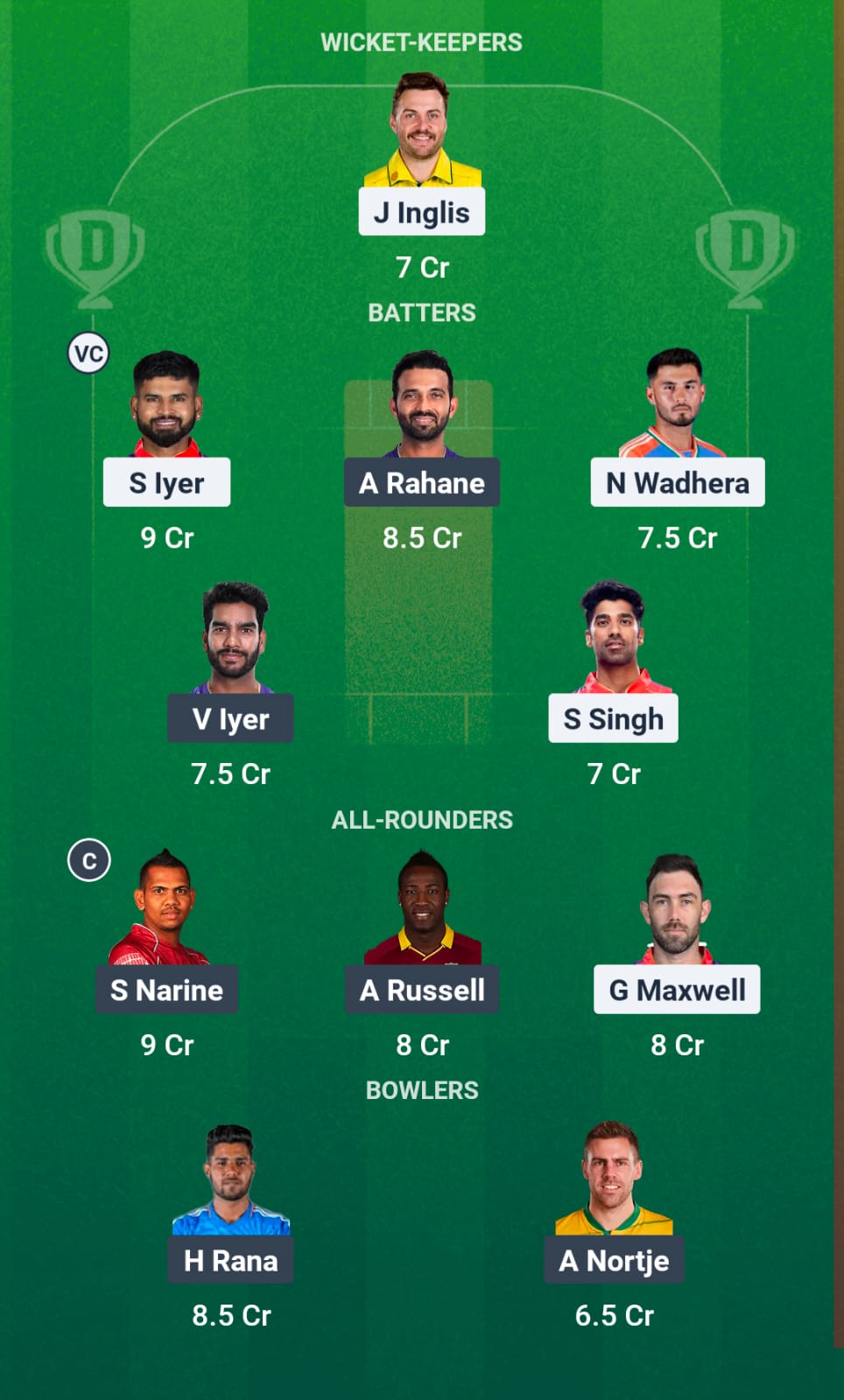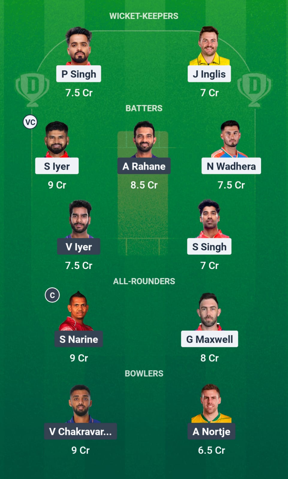 Quinton de Kock (wk), Sunil Narine, Ajinkya Rahane (c), Rinku Singh, Venkatesh Iyer, Andre Russell, Ramandeep Singh, Vaibhav Arora, Moeen Ali, Harshit Rana, Varun Chakravarthy