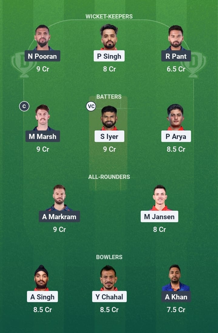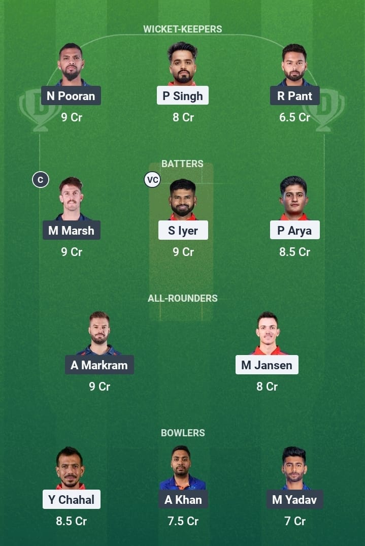 Prabhsimran Singh, Priyansh Arya, Josh Inglis (wk), Shreyas Iyer (c), Nehal Wadhera, Shashank Singh, Azmatullah Omarzai, Marco Jansen, Harpreet Brar, Yuzvendra Chahal, Arshdeep Singh