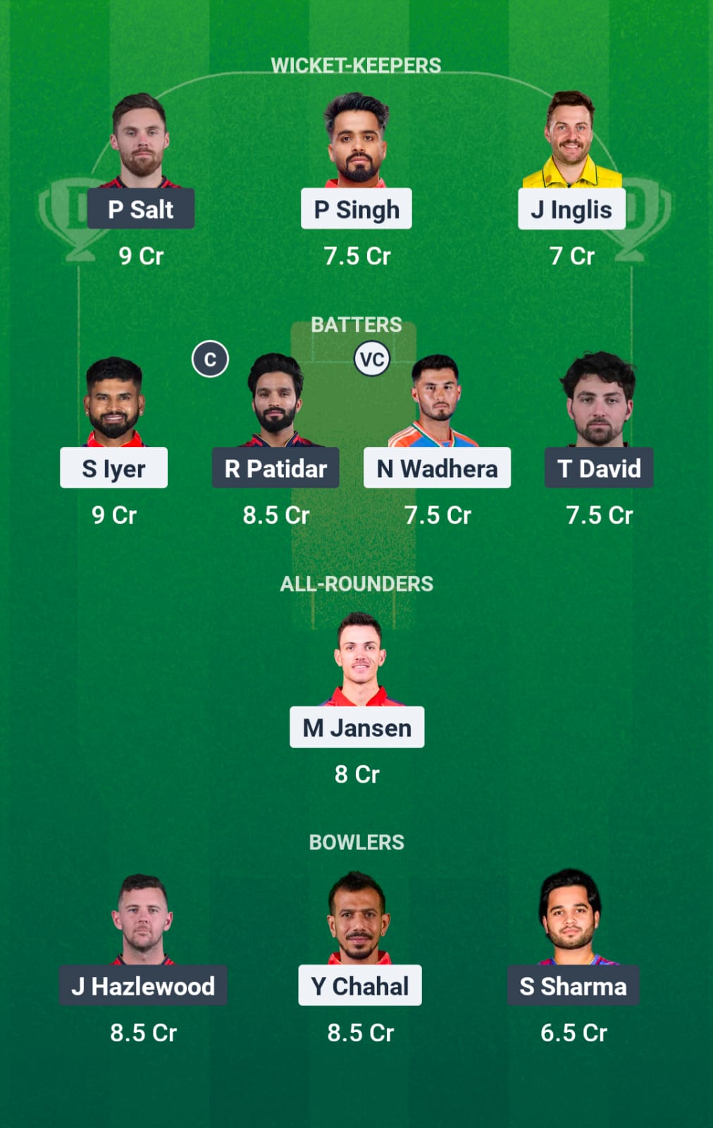 Phil Salt, Virat Kohli, Rajat Patidar (c), Liam Livingstone, Jitesh Sharma (wk), Krunal Pandya, Tim David, Bhuvneshwar Kumar, Yash Dayal, Josh Hazlewood, Suyash Sharma