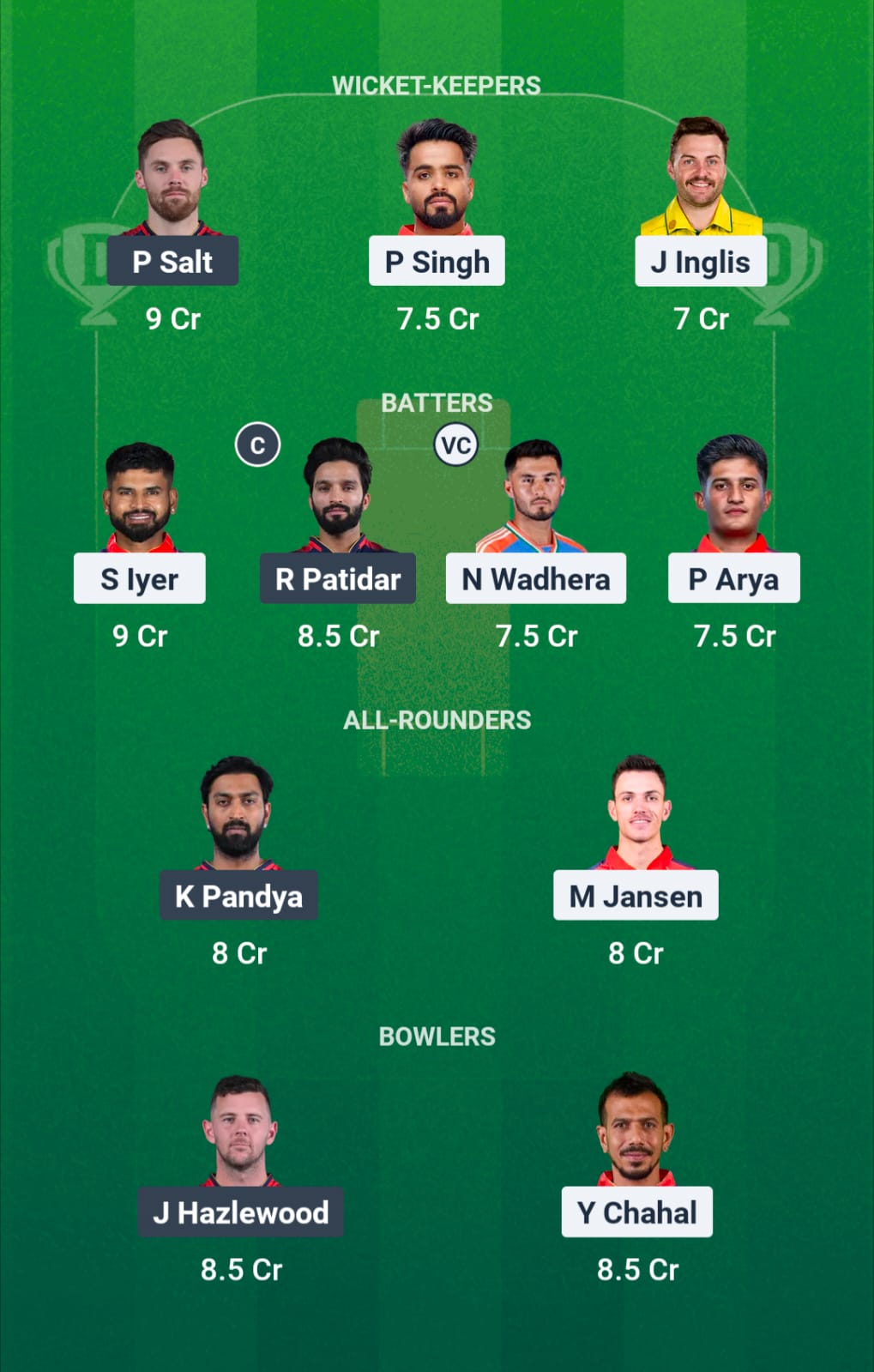Priyansh Arya, Prabhsimran Singh, Shreyas Iyer (c), Josh Inglis (wk), Nehal Wadhera, Marcus Stoinis, Shashank Singh, Marco Jansen, Xavier Bartlett, Arshdeep Singh, Yuzvendra Chahal