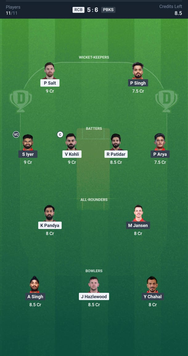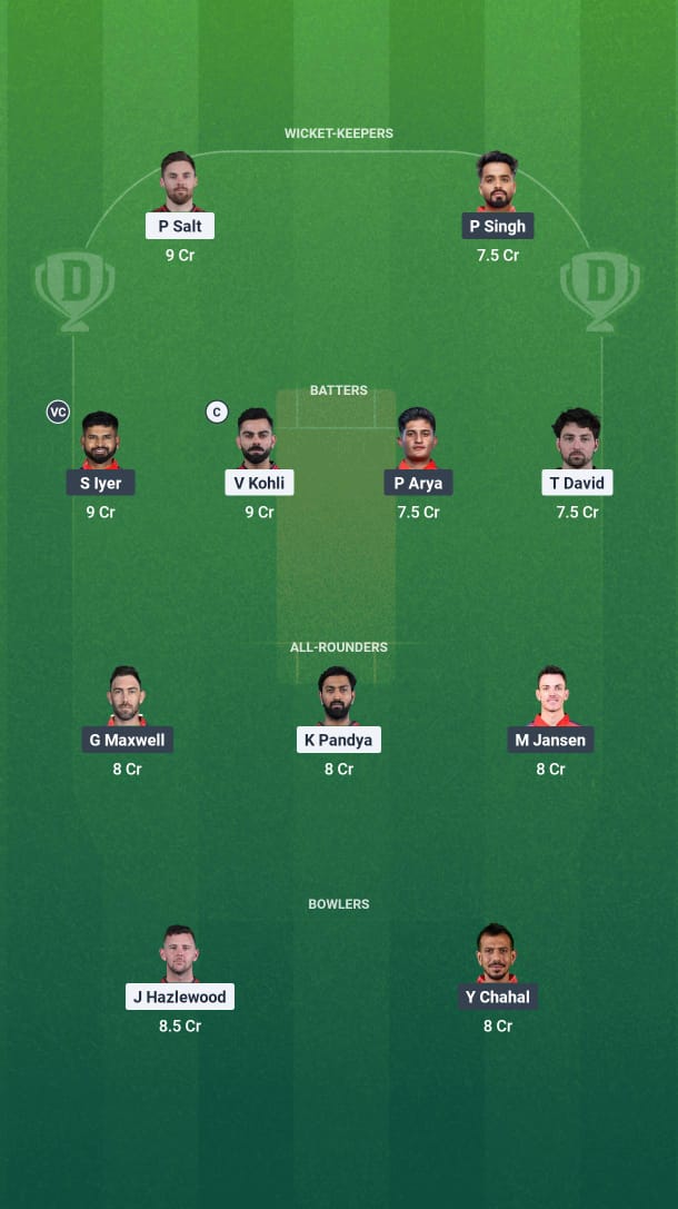 Phil Salt, Virat Kohli, Devdutt Padikkal, Rajat Patidar (C), Jitesh Sharma (WK), Liam Livingstone, Krunal Pandya, Tim David, Josh Hazlewood, Yash Dayal, Bhuvaneshwar Kumar, Tim David