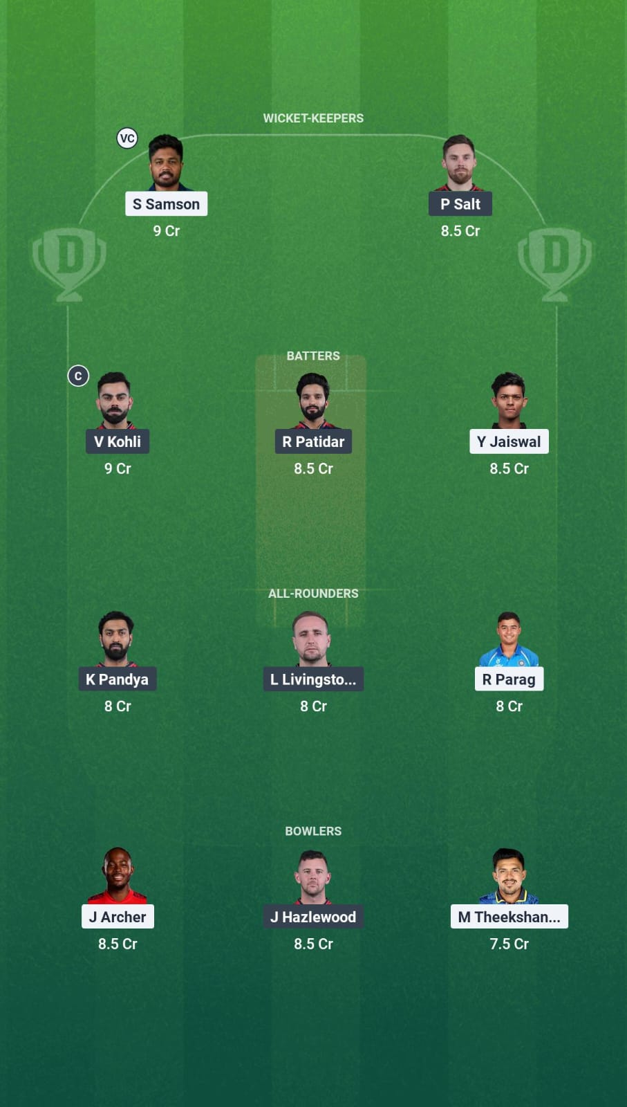 Philip Salt, Virat Kohli, Rajat Patidar (C), Devdutt Padikkal, Liam Livingstone, Jitesh Sharma (WK), Tim David, Krunal Pandya, Bhuvaneshwar Kumar, Yash Dayal, Josh Hazlewood