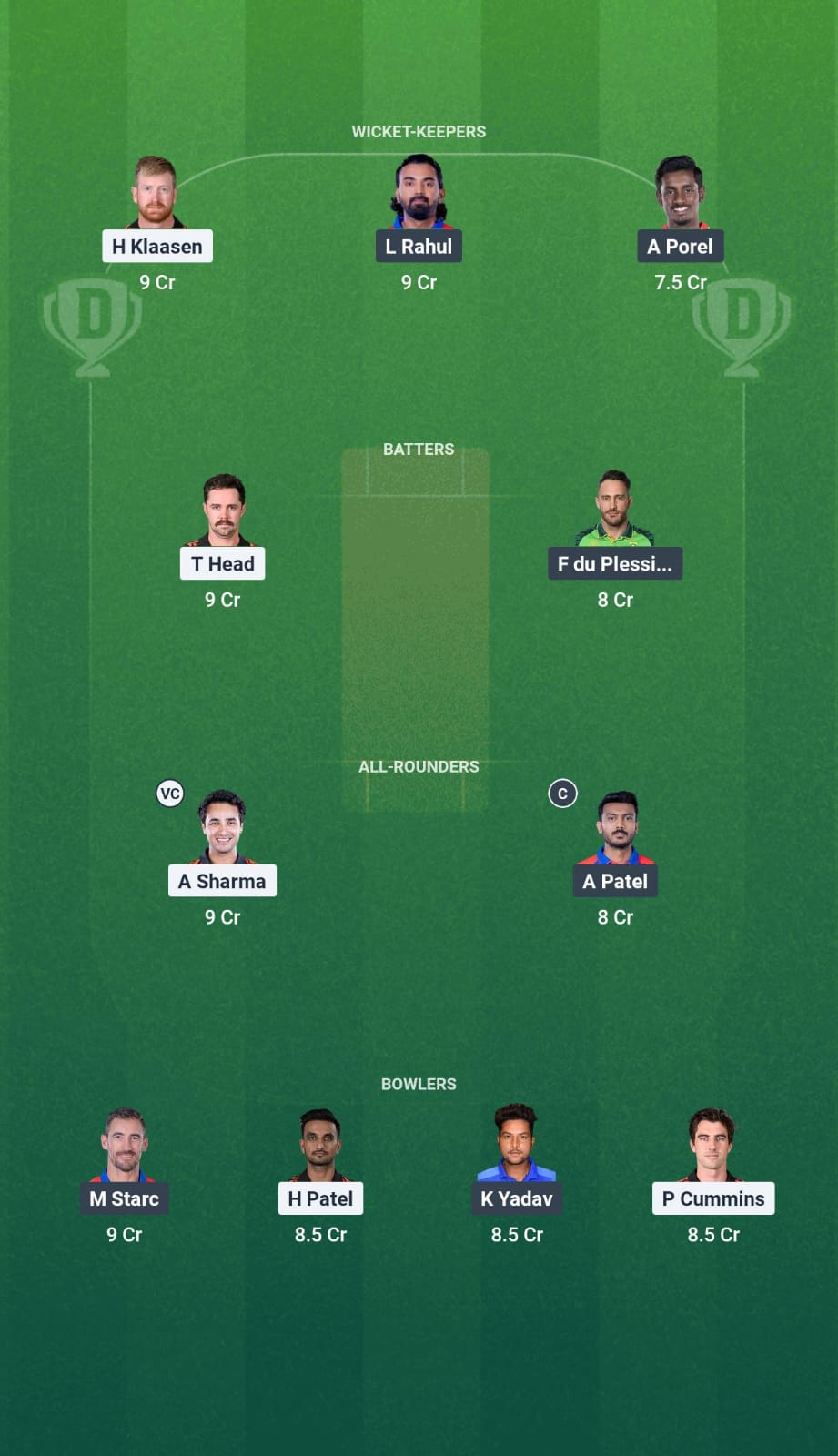Faf du Plessis, Abishek Porel (WK), Karun Nair, KL Rahul, Axar Patel (c), Tristan Stubbs, Vipraj Nigam, Mitchell Starc, Mukesh Kumar, Dushmantha Chameera, Kuldeep Yadav