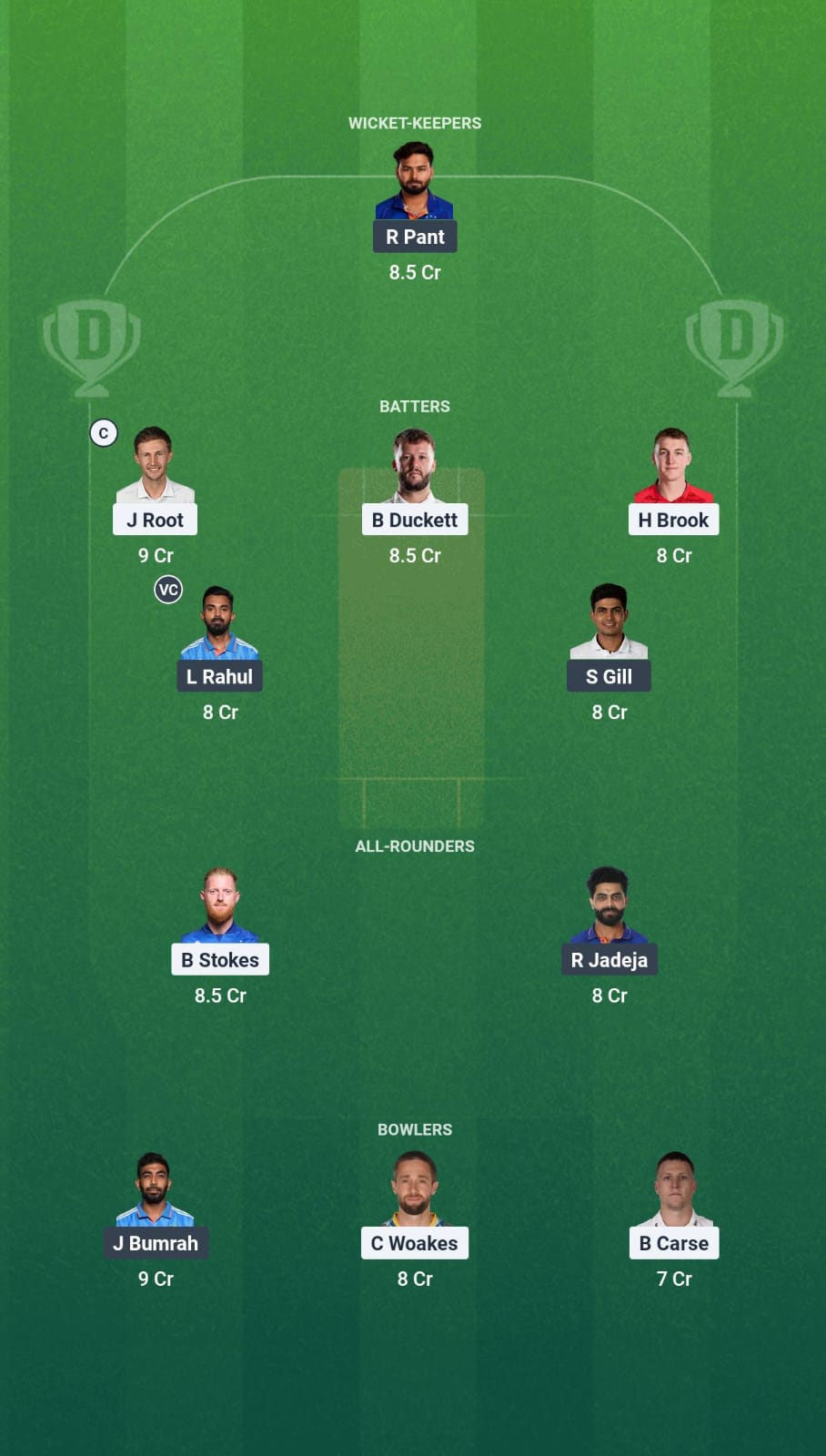 Joe Root is among the most experienced batsmen in this match and is the obvious choice. We are also selecting KL Rahul, Ben Duckett, Shubman Gill, and Harry Brook.