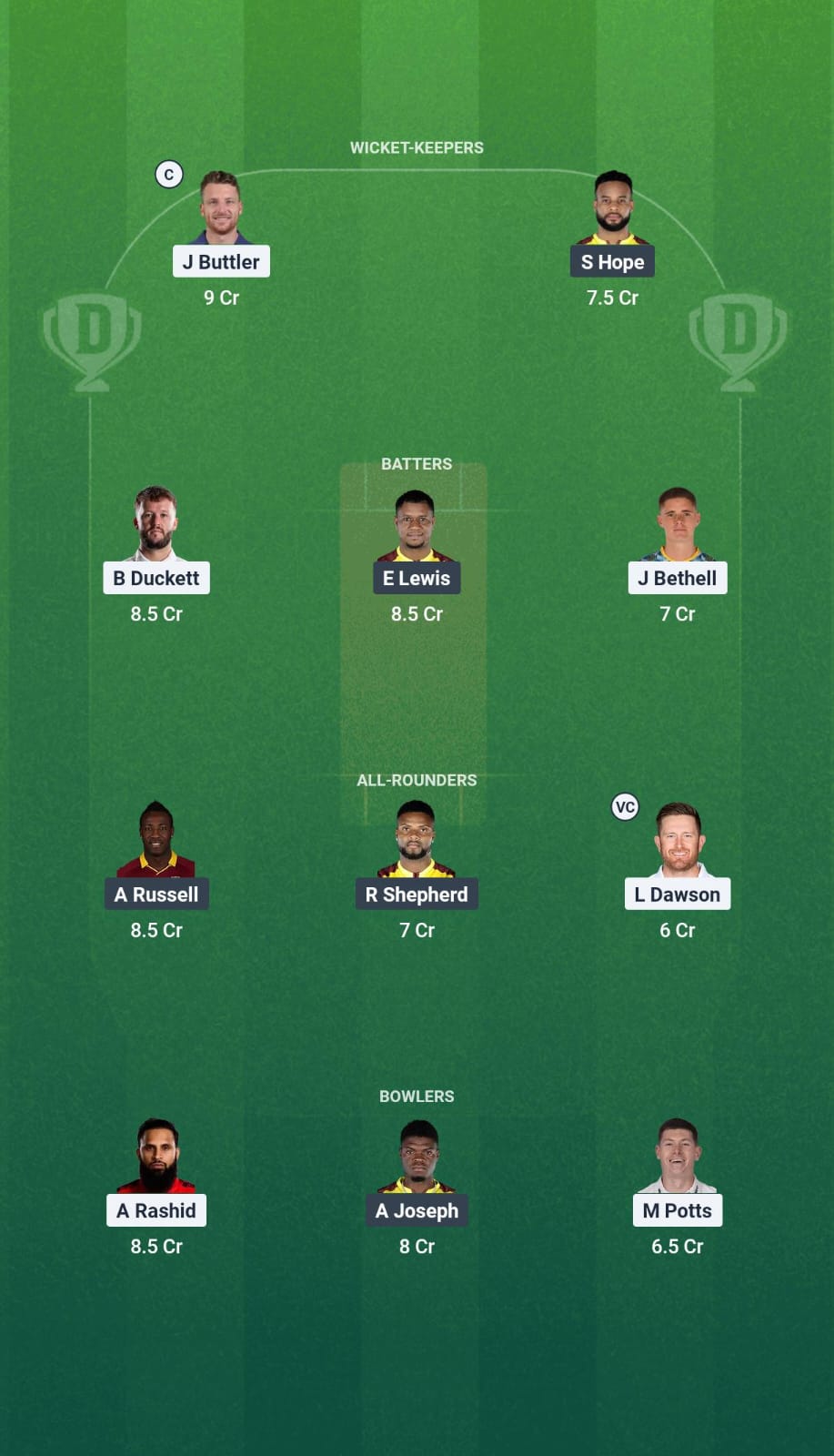 Liam Dawson was excellent in the previous match and is a natural choice. Andre Russell and Romario Shepherd are both quality all-rounders as well.