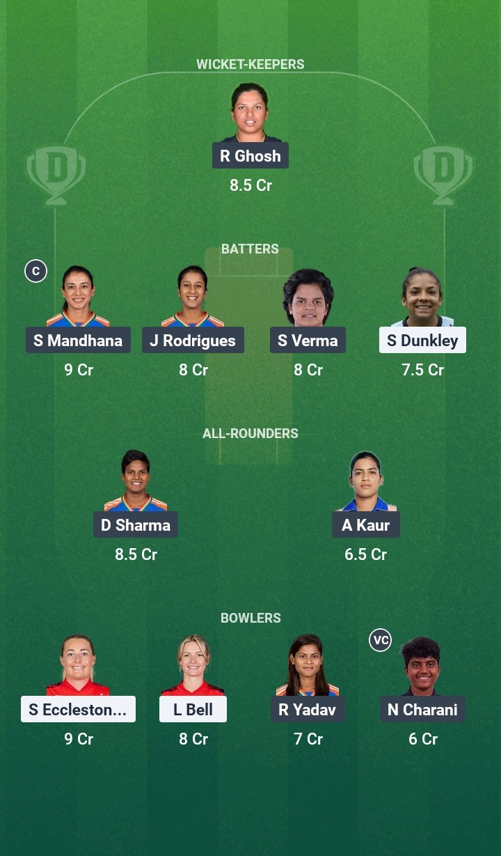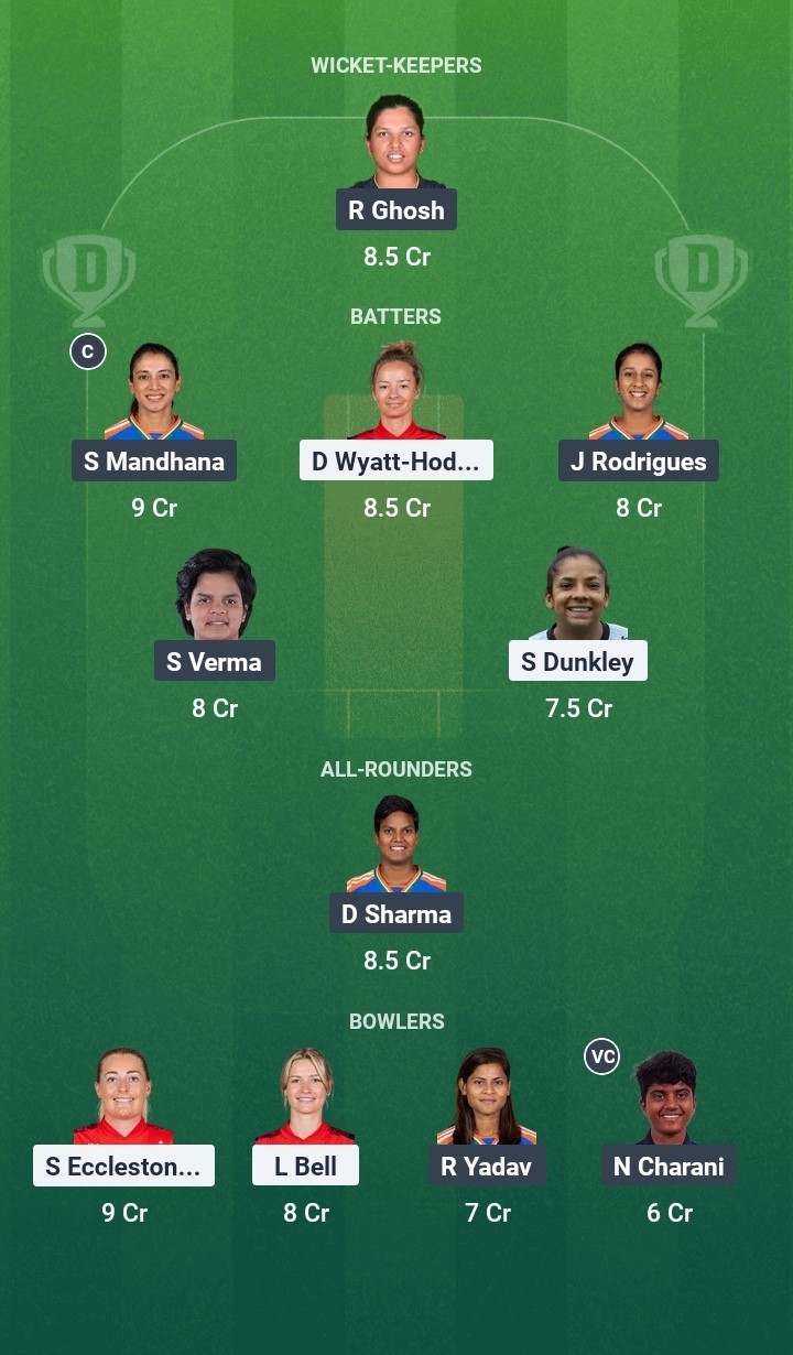 The bowlers expected to do well in this encounter are Sophie Ecclestone, Charlie Dean, Lauren Bell, Arundhati Reddy, Radha Yadav, and Shree Charani.