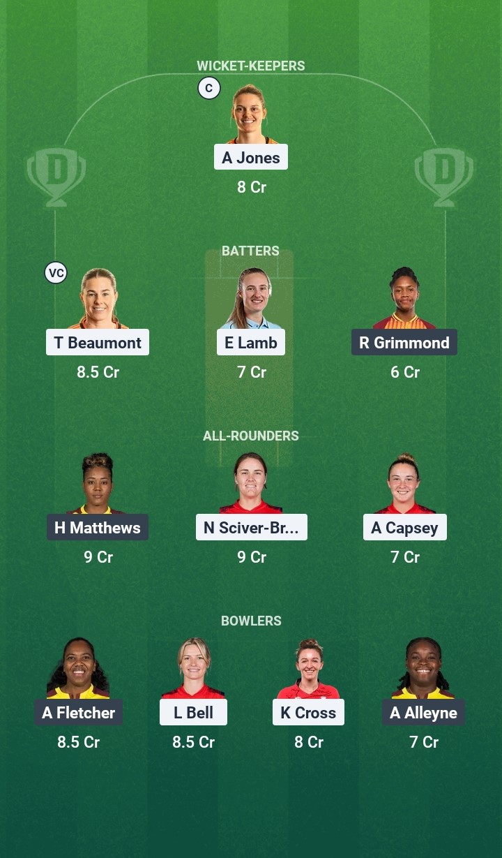 The regular West Indies Women's team skipper Hayley Matthews is likely to miss this encounter. In her absence, we recommend the in-form Amy Jones to lead the side. She has scored 251 runs in the series so far.