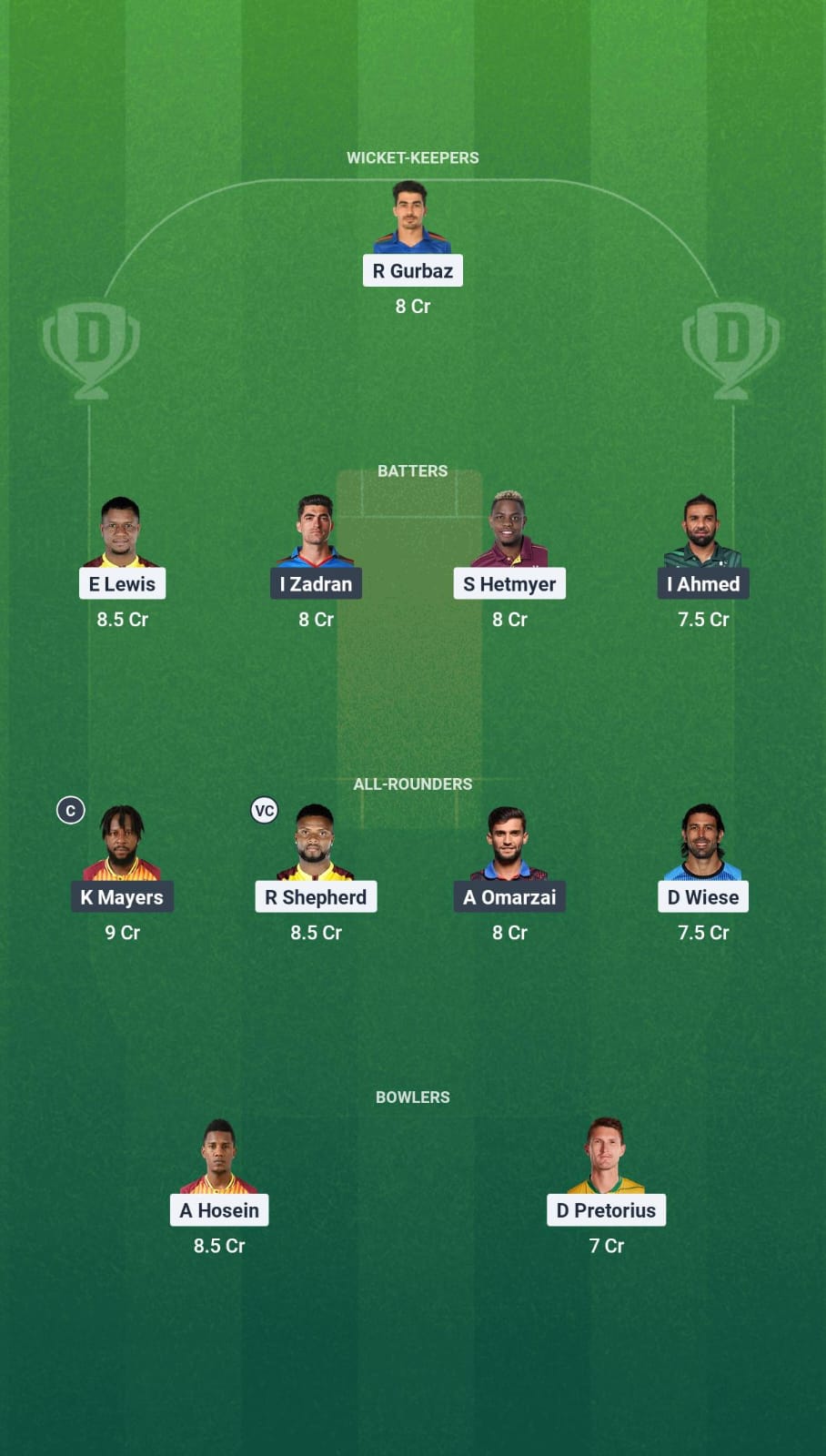 Rahmanullah Gurbaz (WK), Evin Lewis, Johnson Charles, Shimron Hetmeyer, Romario Shepherd, Moeen Ali, David Weise, Akeal Hosein, Imran Tahir (C), Dwaine Pretorius. Shamar Springer
