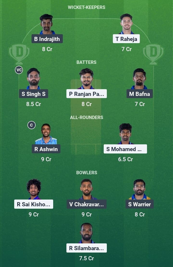 Ravichandran Ashwin (c), Shivam Singh, Vimal Khumar, Baba Indrajith (wk), Maan Bafna, Aakaash Sharma, M Karthik Saran, Varun Chakravarthy, Sandeep Warrier, DT Chandrasekar, Ganeshan Periyaswamy