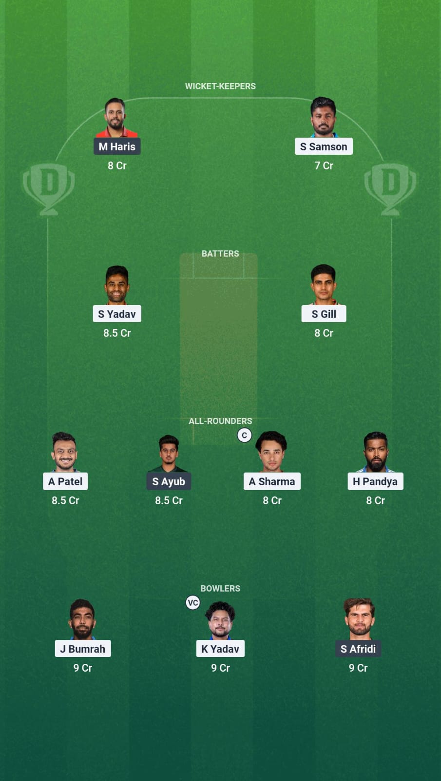 Abhishek Sharma, Shubman Gill, Tilak Varma, Suryakumar Yadav (C), Hardik Pandya, Shivam Dube, Axar Patel, Jasprit Bumrah, Sanju Samson (WK), Kuldeep Yadav, Varun Chakravarthy
