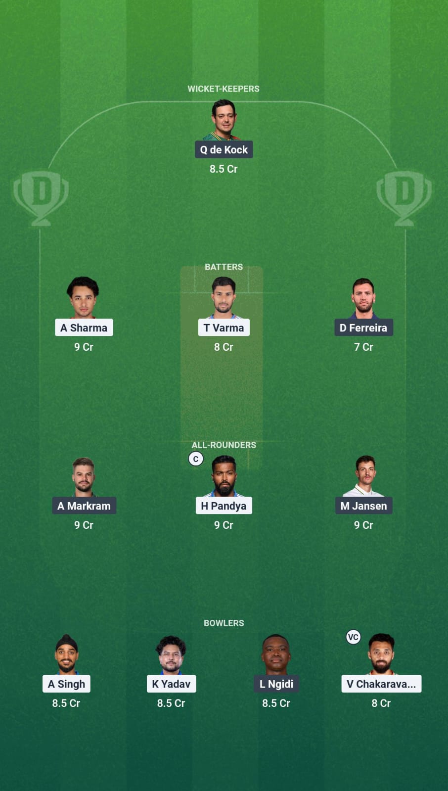 The bowlers are likely to play an important role in this match. We are selecting Kuldeep Yadav and Varun Chakravarthy as the two specialist spinners, while Lungi Ngidi and Arshdeep Singh come in as a new-ball pair.