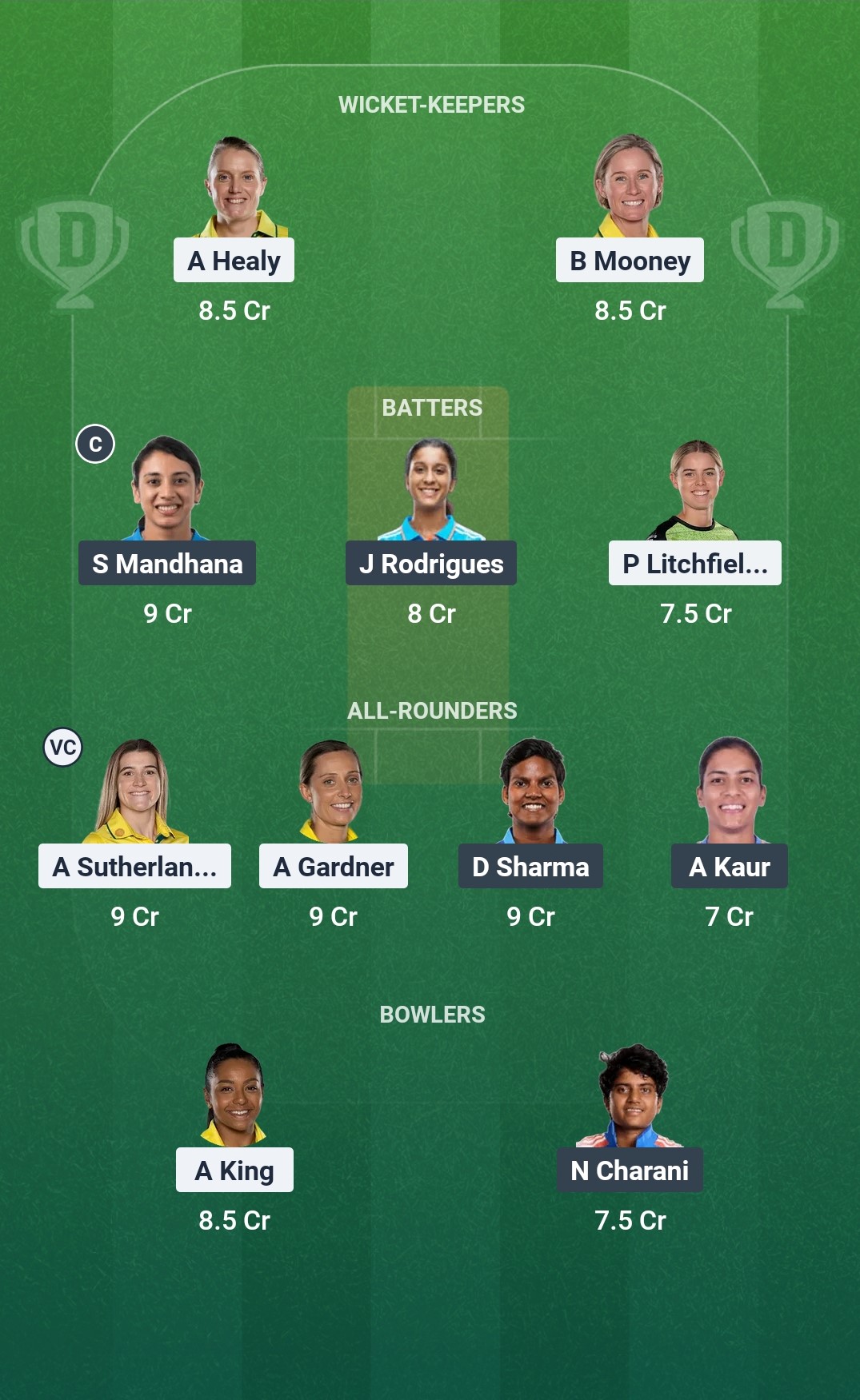 The best all-rounders playing this contest are Harmanpreet Kaur, Amanjot Kaur, Sneh Rana, Deepti Sharma, Ashleigh Gardner, Kim Garth, Heather Graham, Tahila McGrath, Annabel Sutherland, and Ellyse Perry.