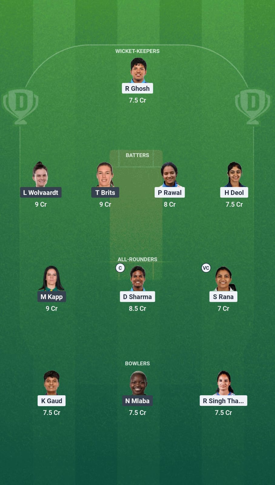 Kranti Gaud comes in as a specialist seamer, while Nonkululeko Mlaba, who has bowled well for South Africa, is our choice to bowl during the middle overs.