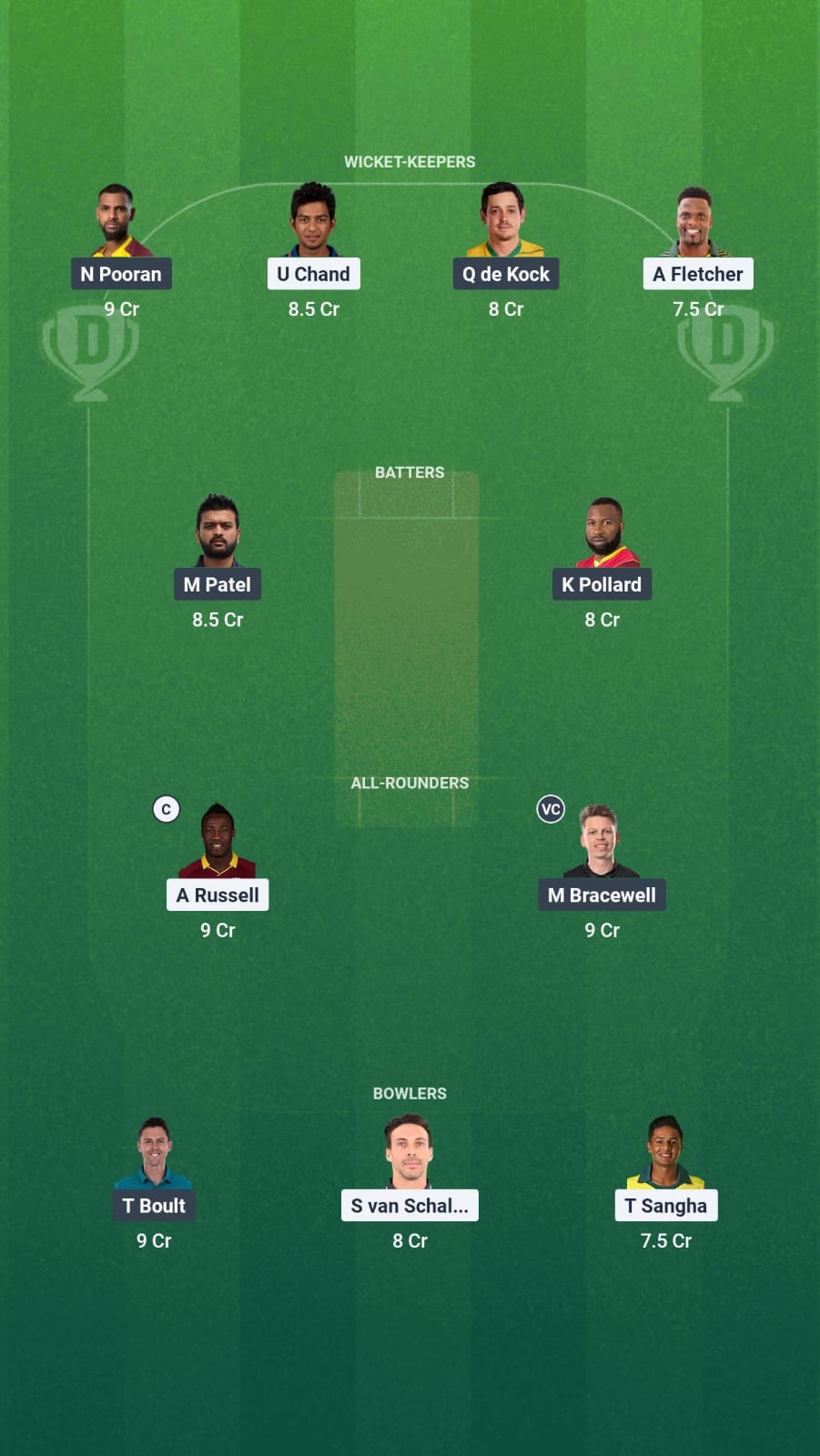 As the pitch is likely to help the seamers, we are opting for Trent Boult and Shadley van Schalkwyk. Tanvir Sangha is the specialist spinner.