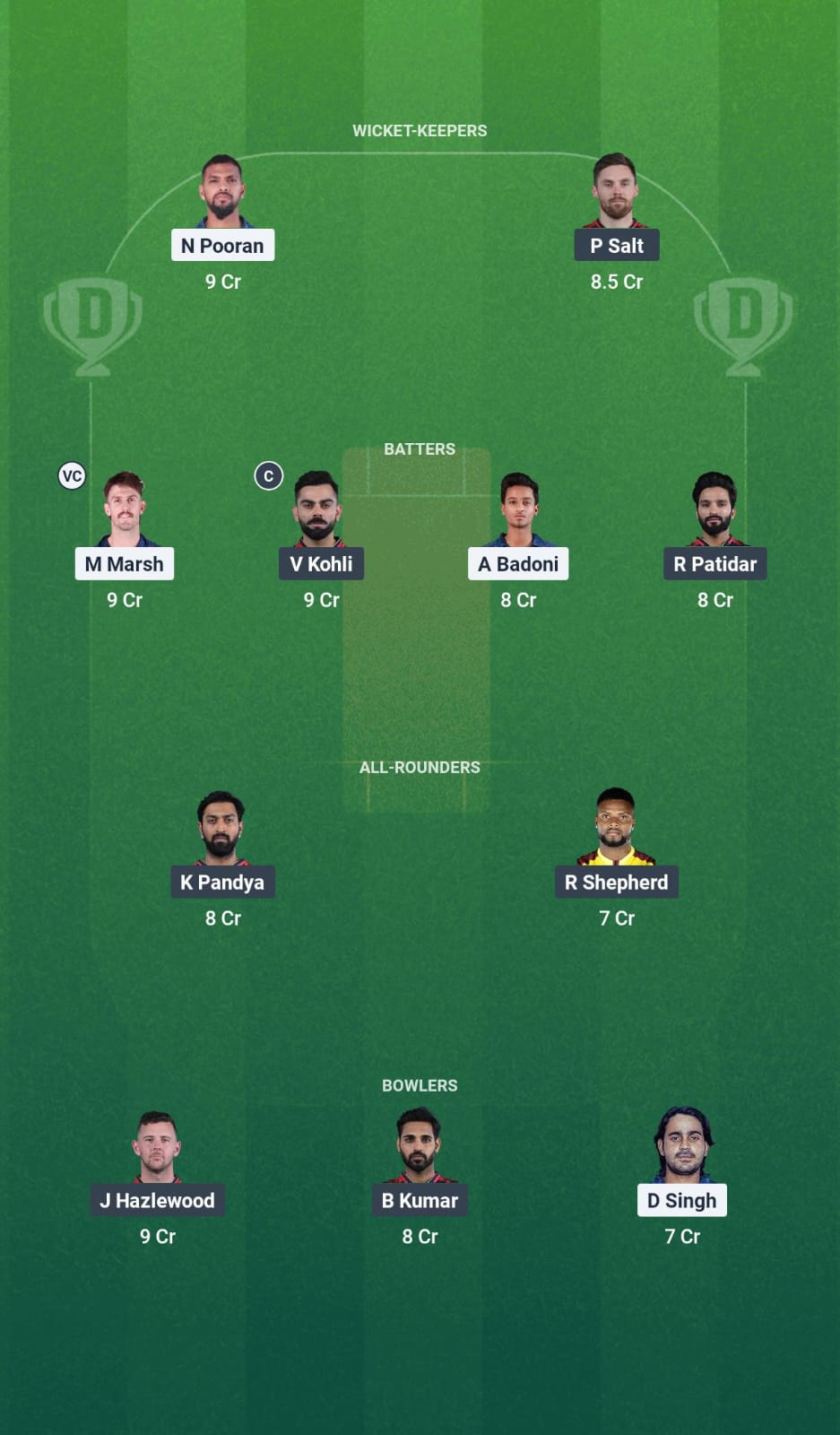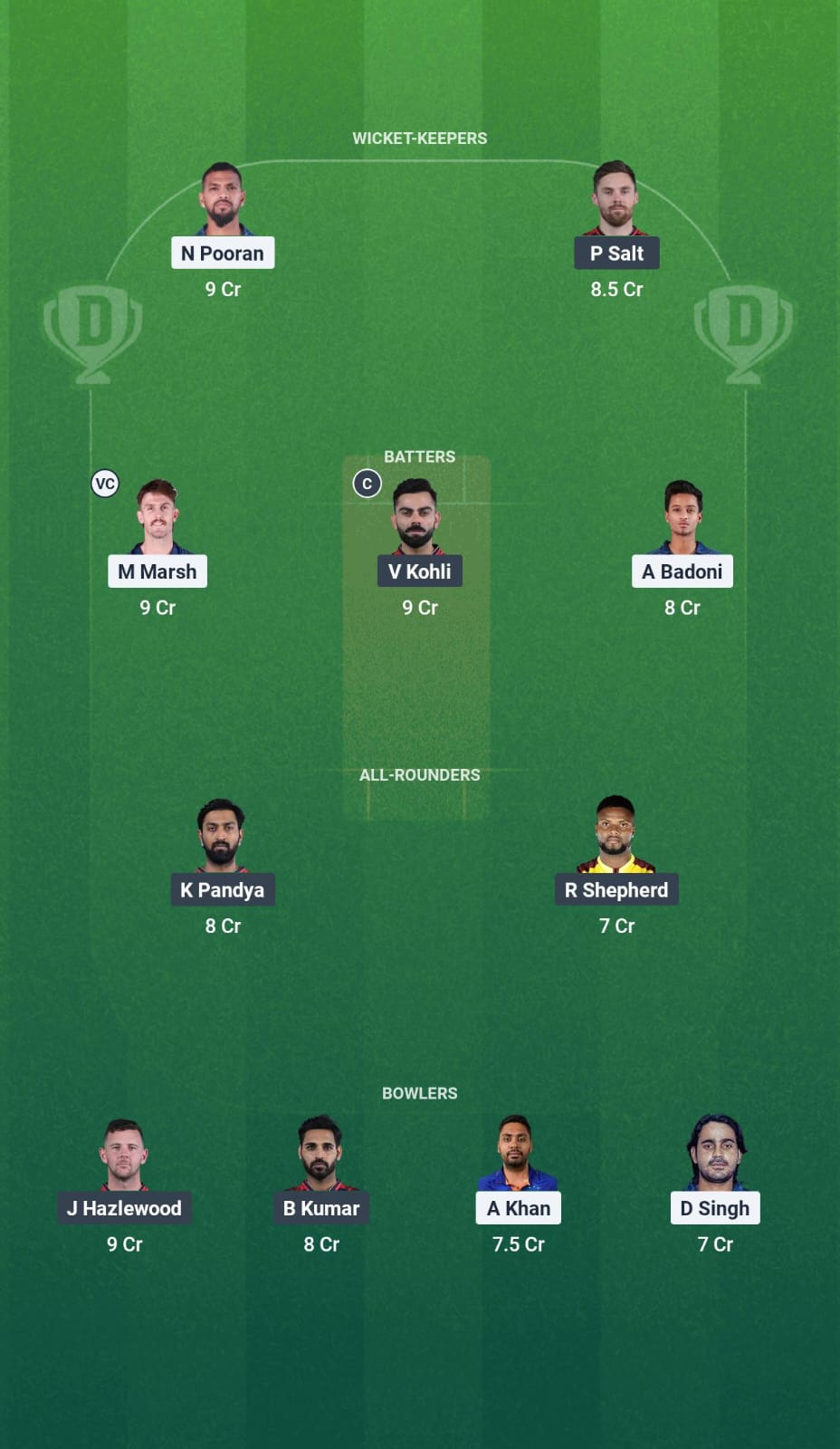 Mitchell Marsh and Virat Kohli are the leading run-scorers for their respective teams and are the top picks. We are also selecting Ayush Badoni as he has played some impressive knocks for RCB.