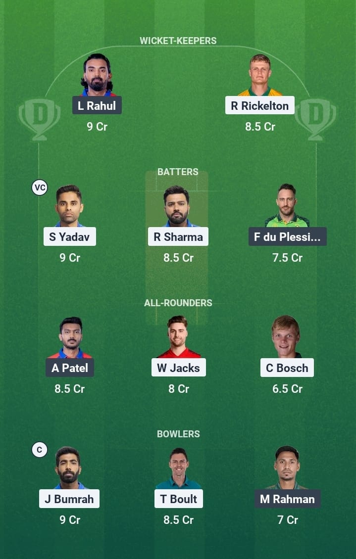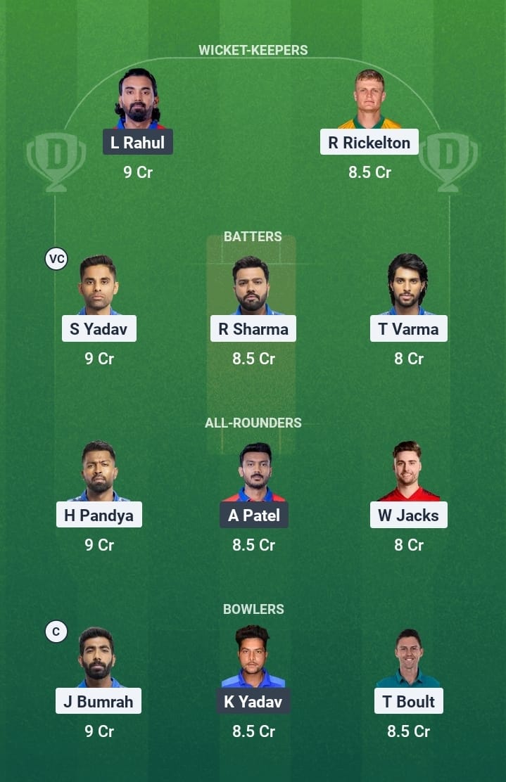 Ryan Rickelton (wk), Rohit Sharma, Will Jacks, Suryakumar Yadav, Tilak Varma, Hardik Pandya (c), Naman Dhir, Corbin Bosch, Deepak Chahar, Trent Boult, Jasprit Bumrah, Ashwani Kumar