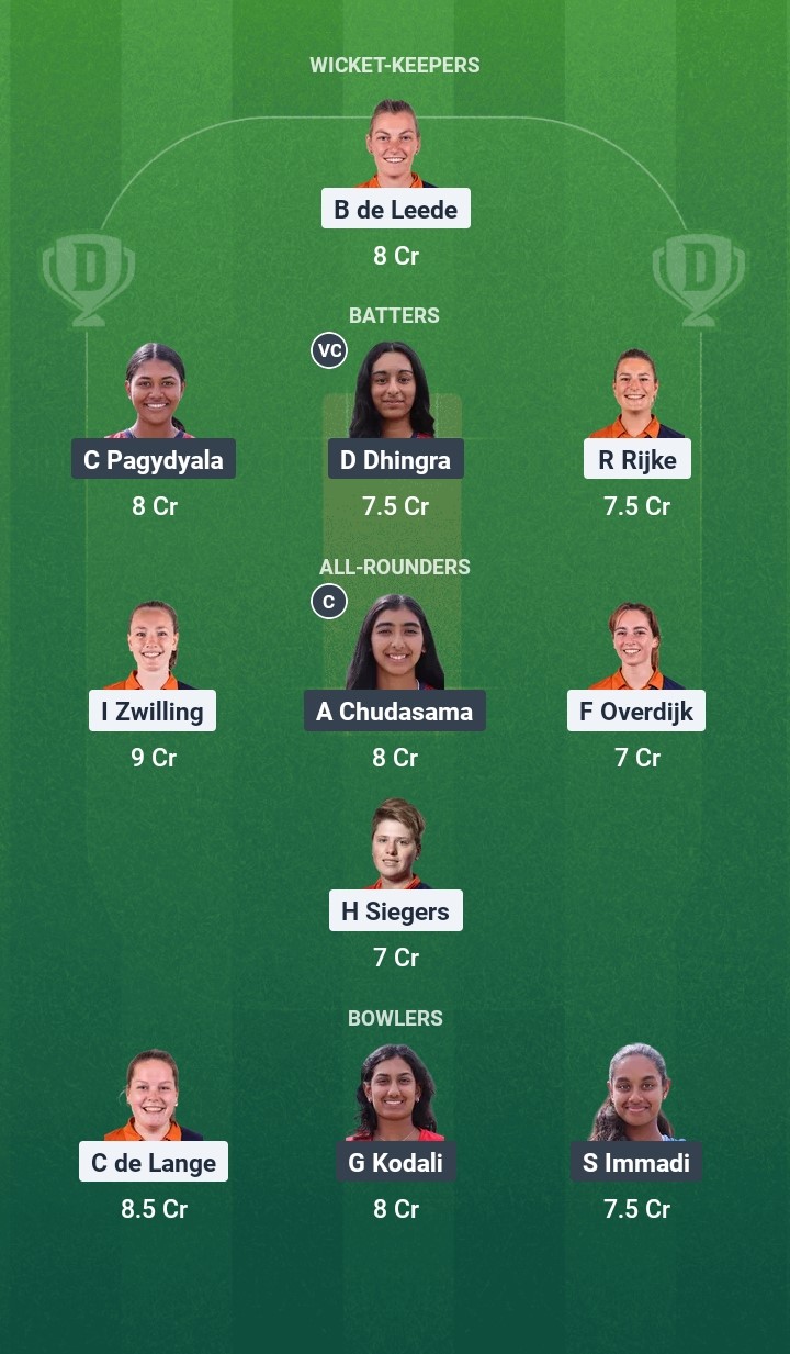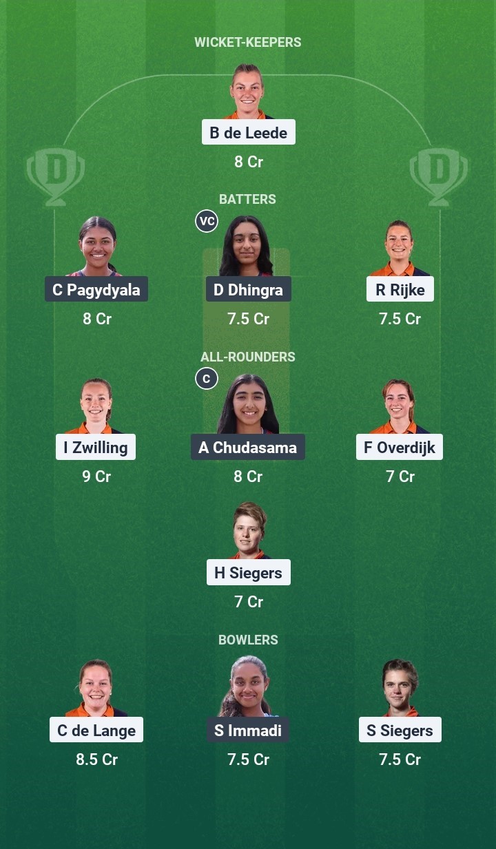 The top all-rounders for this fixture include I Zwilling, A Chudasama, F Overdijk, and H Siegers. In recent games, they are doing a good job with the bat and ball.