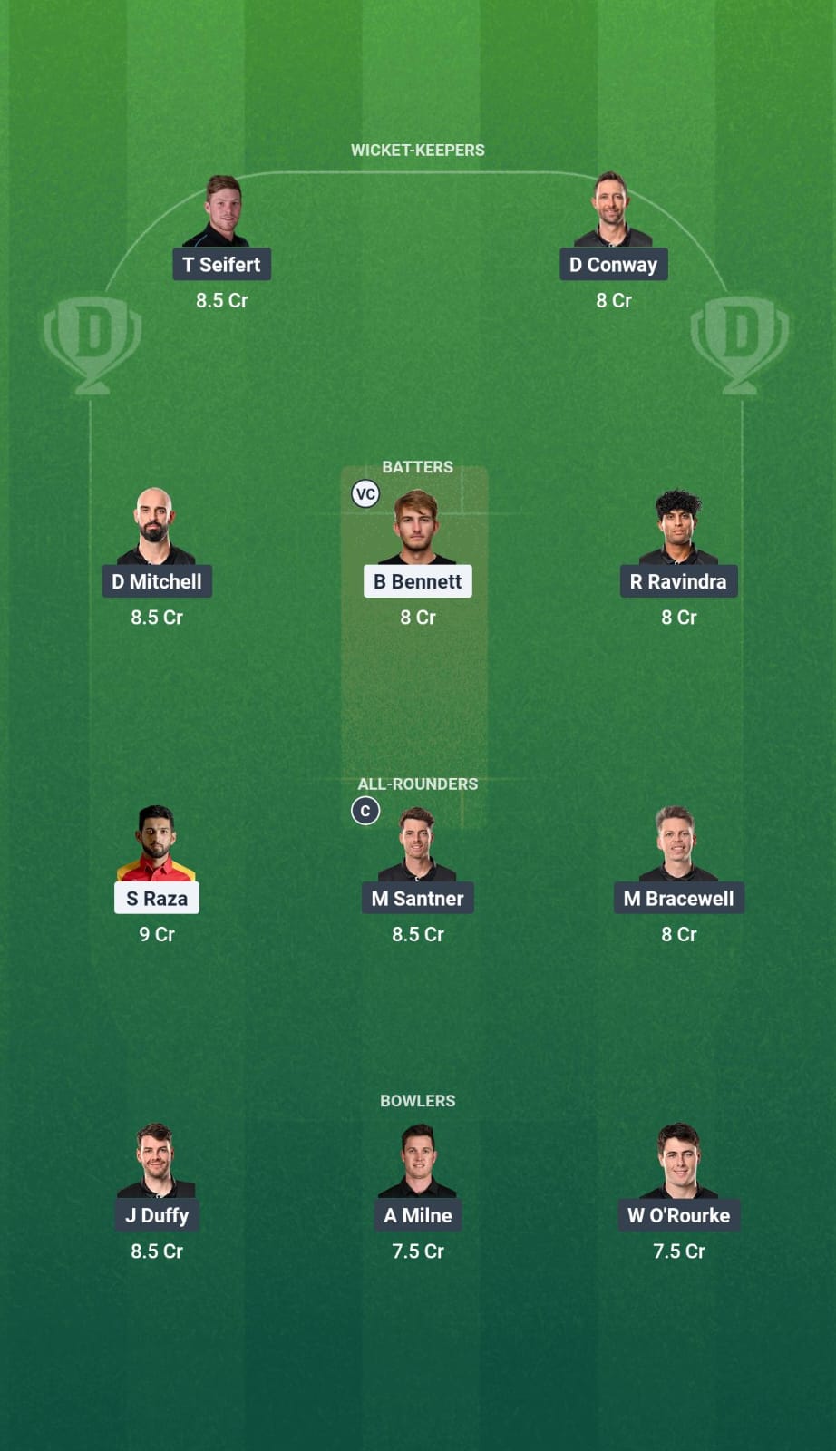 Devon Conway, Tim Seifert (WK), Rachin Ravindra, Mark Chapman, Daryl Mitchell, Matt Henry, Jacob Duffy, Mitchell Santner (C), Michael Bracewell, Ish Sodhi, Adam Milne