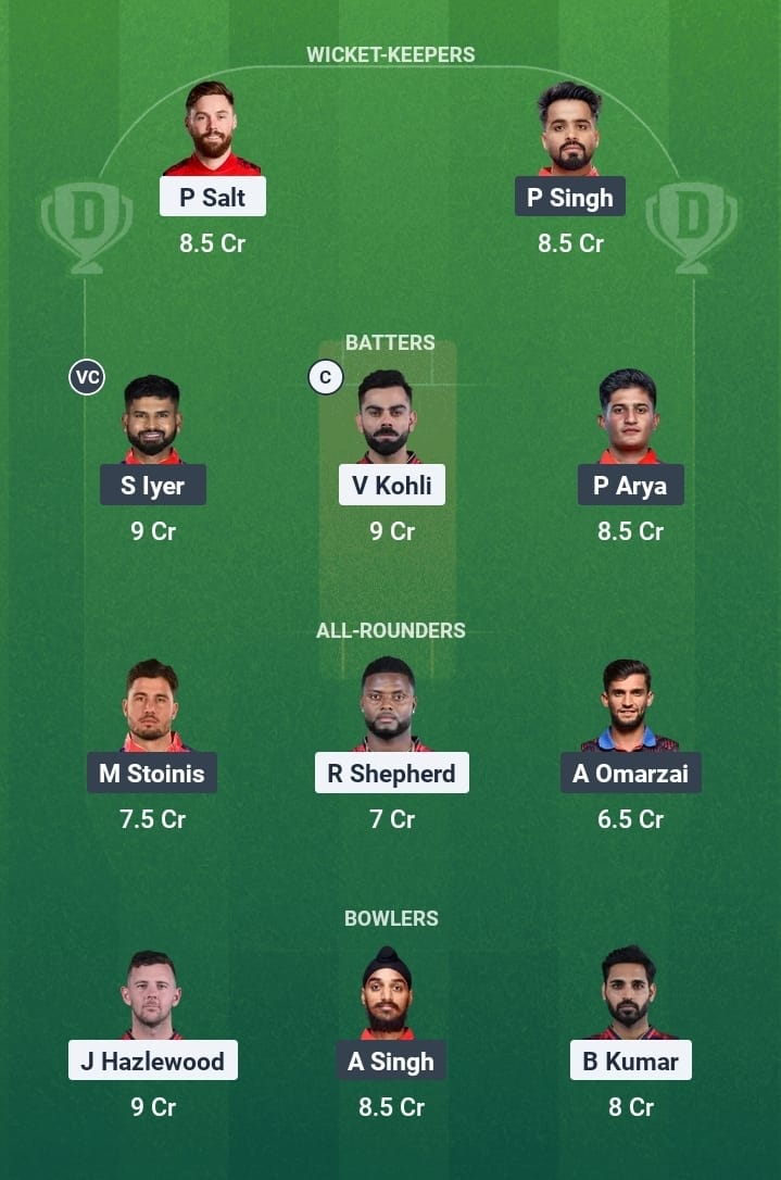 Phil Salt, Virat Kohli, Mayank Agarwal, Rajat Patidar (c), Liam Livingstone, Jitesh Sharma (wk), Romario Shepherd, Bhuvneshwar Kumar, Yash Dayal, Josh Hazlewood, Suyash Sharma