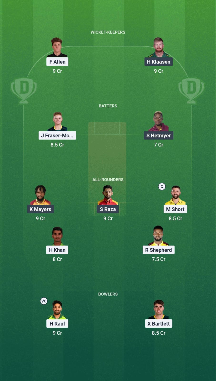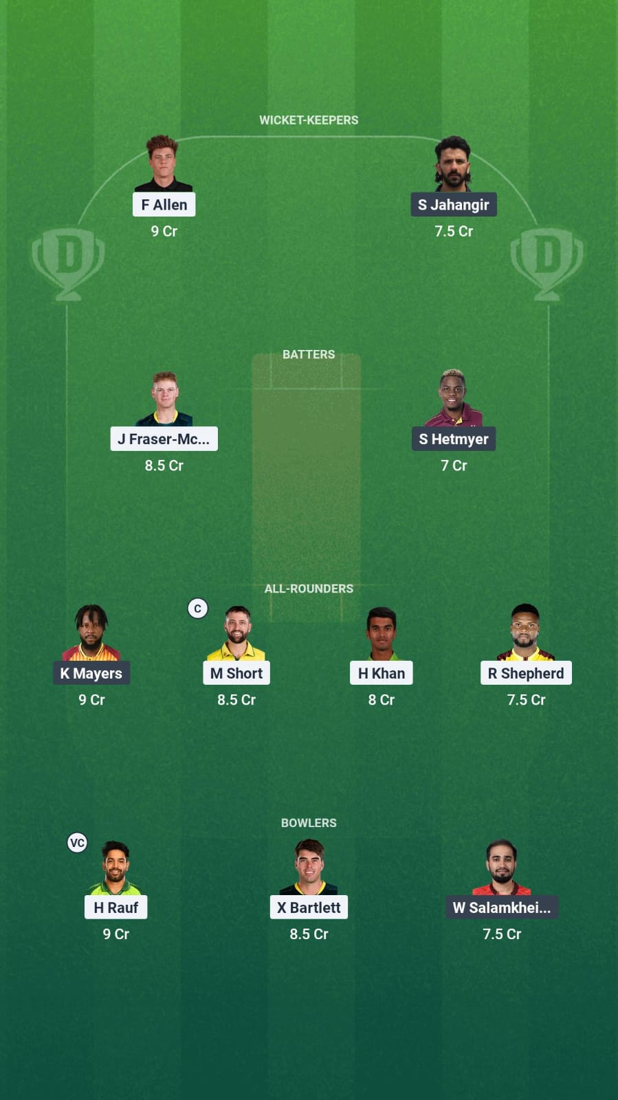 Both teams have some quality all-rounders to choose from. Matthew Short, Kyle Mayers, Romario Shepherd, and Hassan Khan are all in good form and made it to our team.