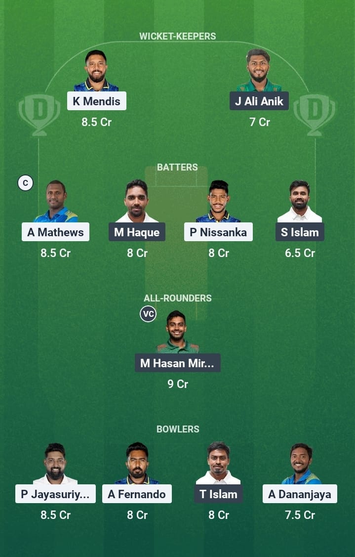 Pathum Nissanka, Oshada Fernando, Dinesh Chandimal, Angelo Mathews, Kamindu Mendis, Dhananjaya de Silva (c), Kusal Mendis (wk), Akila Dananjaya, Prabath Jayasuriya, Asitha Fernando, Kasun Rajitha