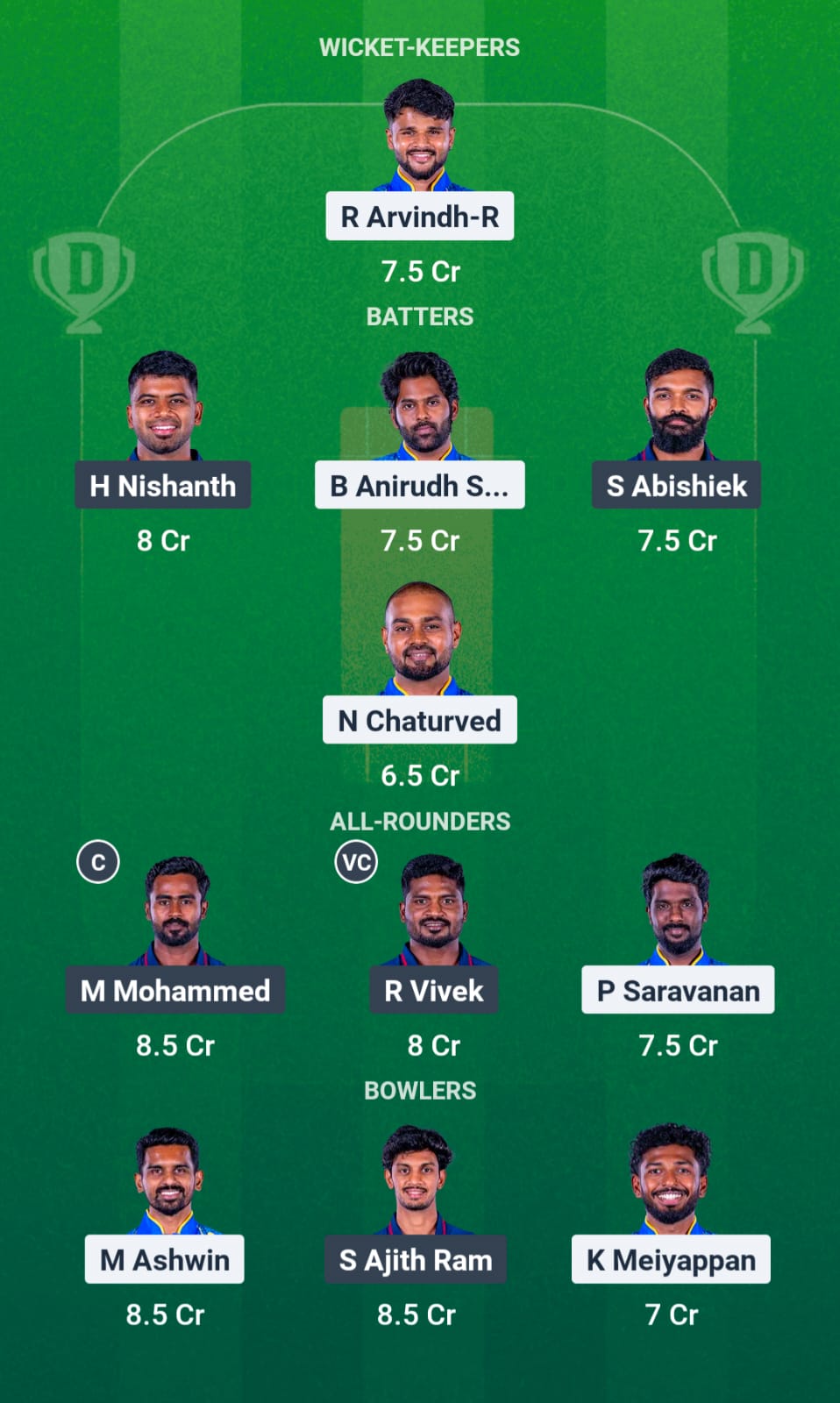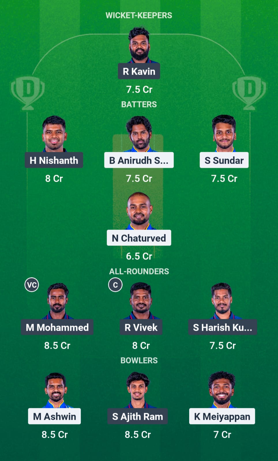 Hari Nishanth, Nidhish Rajagopal, R Kavin (wk), Rajendran Vivek, Boopathi Kumar, Harish Kumar, Pavithran R, Rahil Shah, M Mohammed, Ajith Ram, M Poiyamozhi