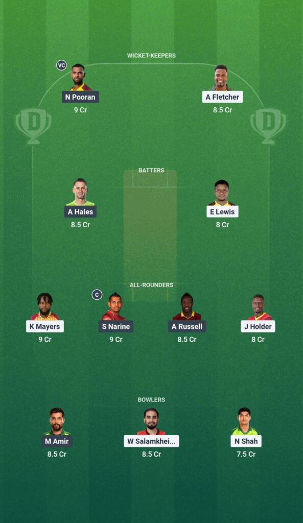 Alex Hales, Sunil Narine, Keacy Carty, Andre Russell, Nicholas Pooran (C & WK), Kieron Pollard, Darren Bravo, Mohammad Amir, Akeal Hosein, Ali Khan, Joshua da Silva