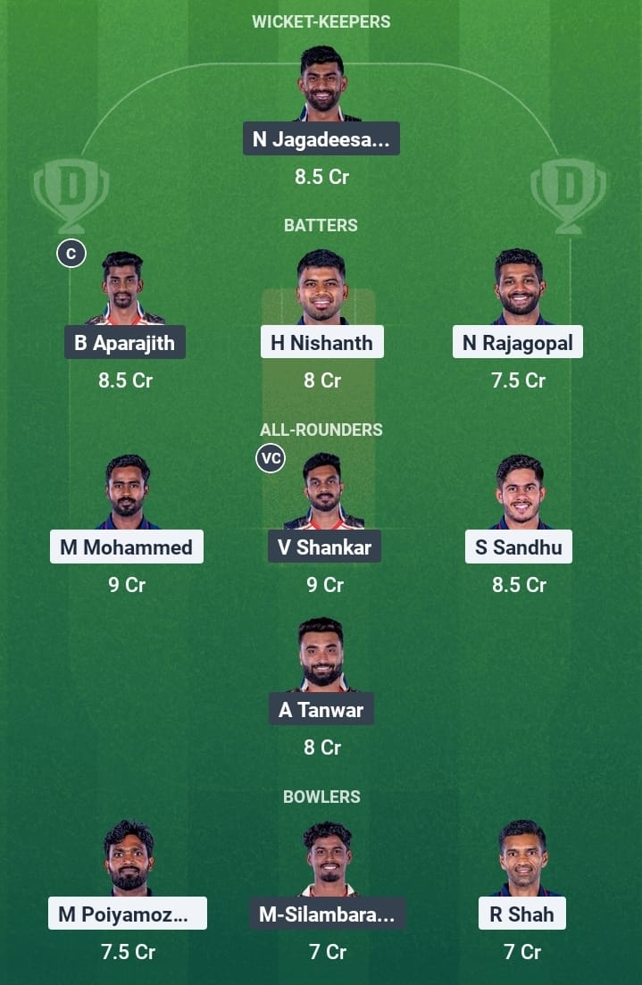 Baba Aparajith is the only batter in both sides to hit more than 200 runs this year. He has 222 runs. Nidhish Rajagopal and Vijay Shankar have 149 and 148 runs respectively.