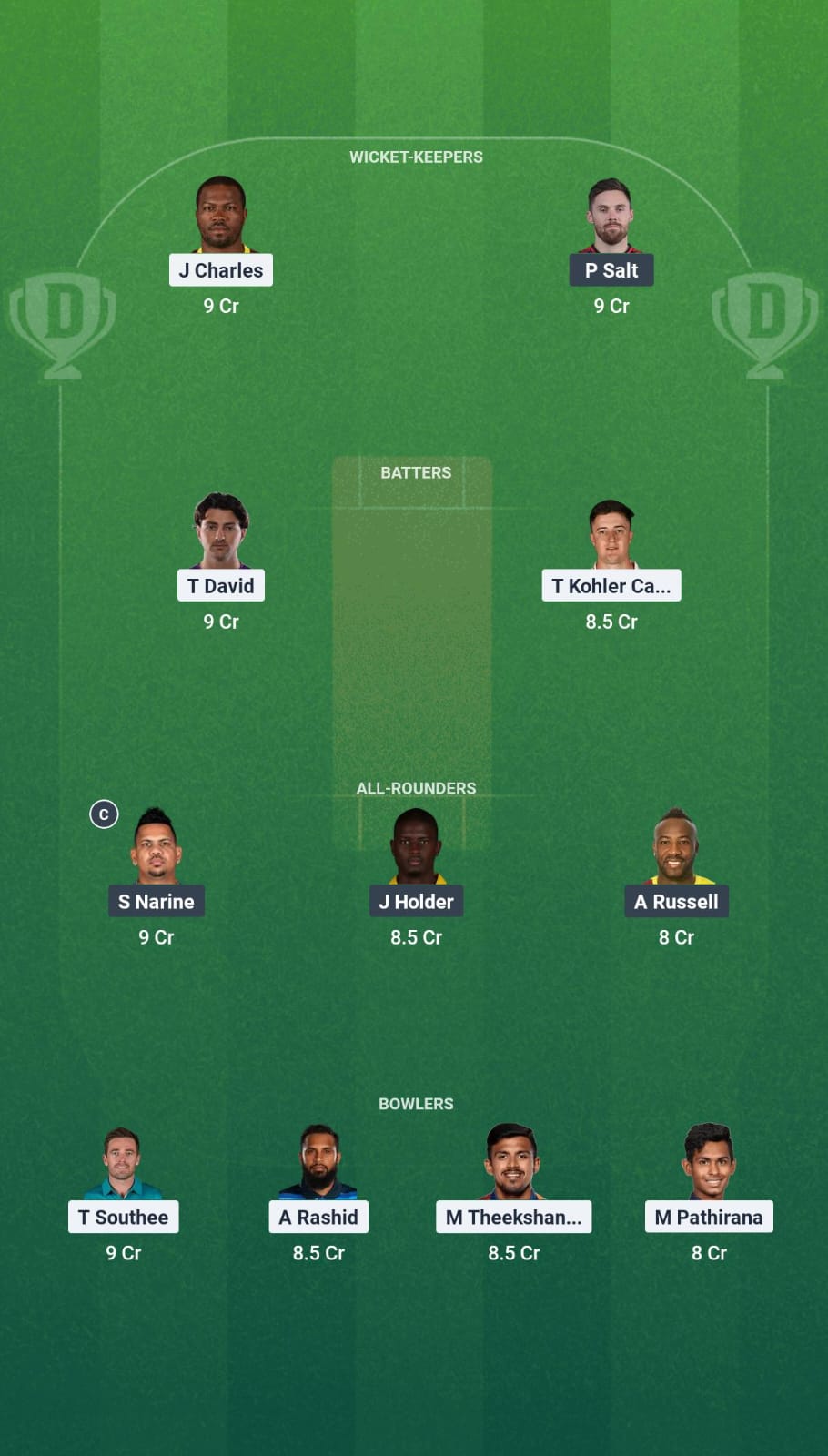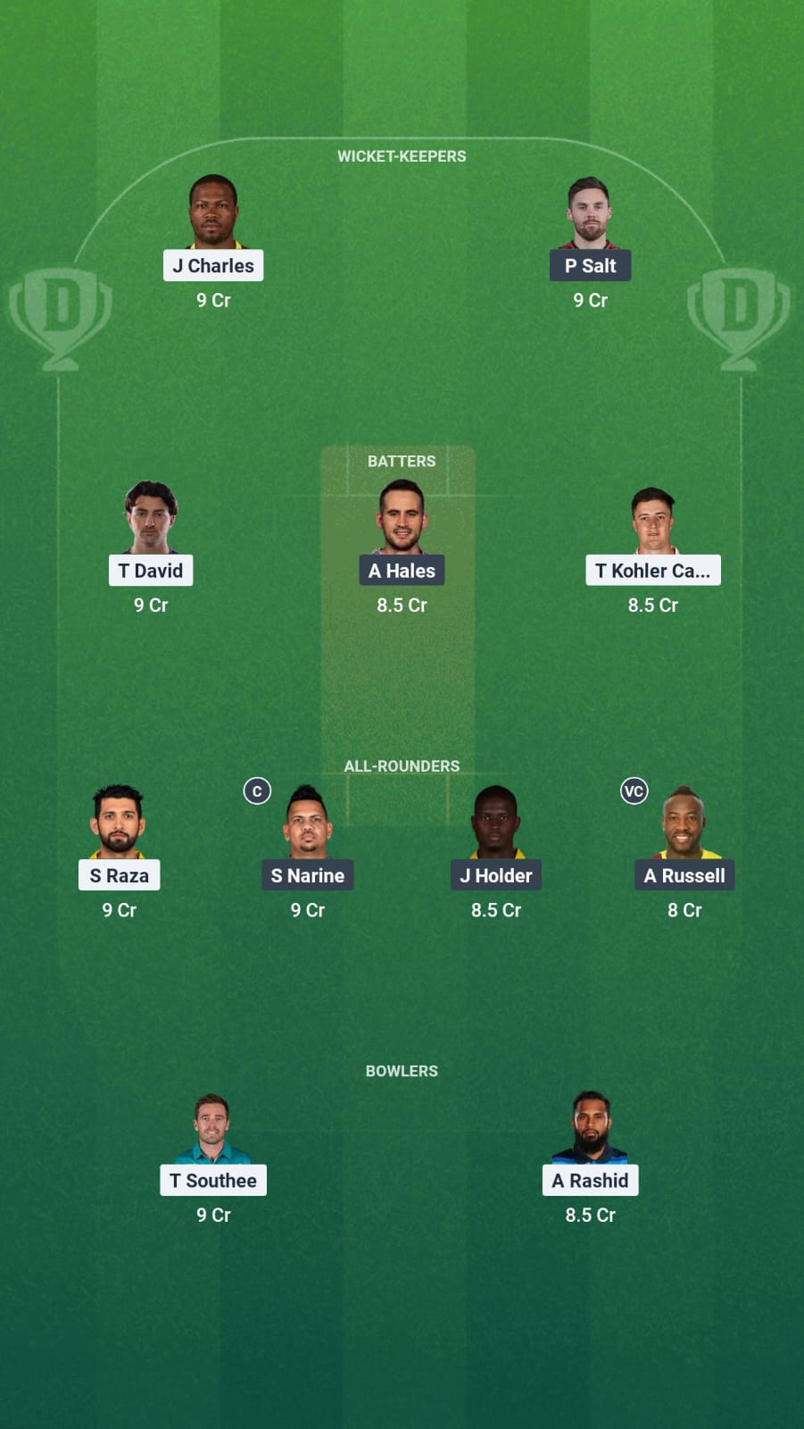 Phil Salt (WK), Alex Hales, Alishan Sharafu, Sherfane Rutherford, Andre Russell, Sunil Narine, Jason Holder (C), Piyush Chawla, Khary Pierre, Olly Stone, Liam Livingstone