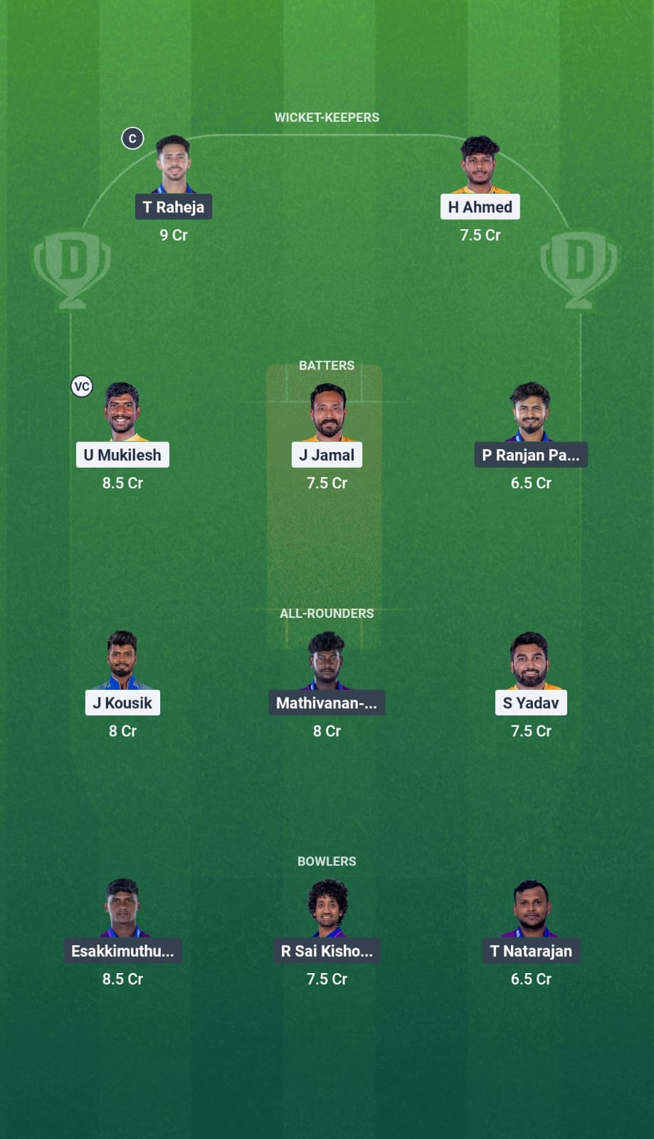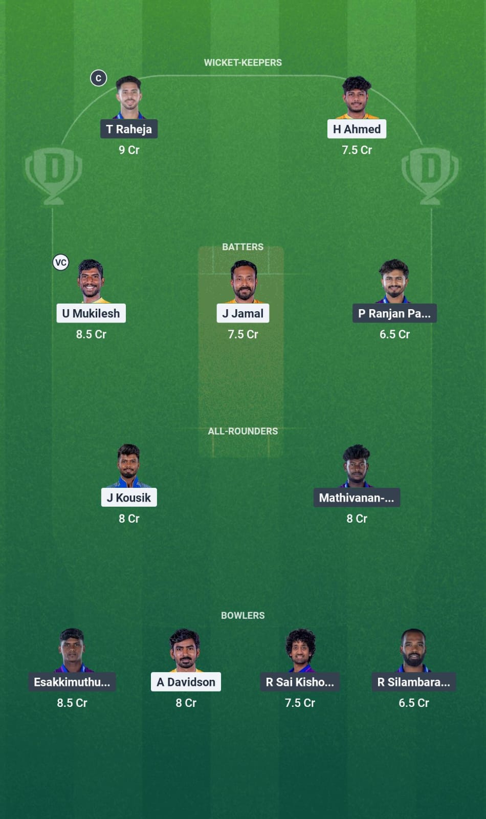 J Kousik, R Rajkumar, and Sanjay Yadav are all quality all-rounders who have plenty of experience playing in the TNPL and can earn points with the bat and the ball.