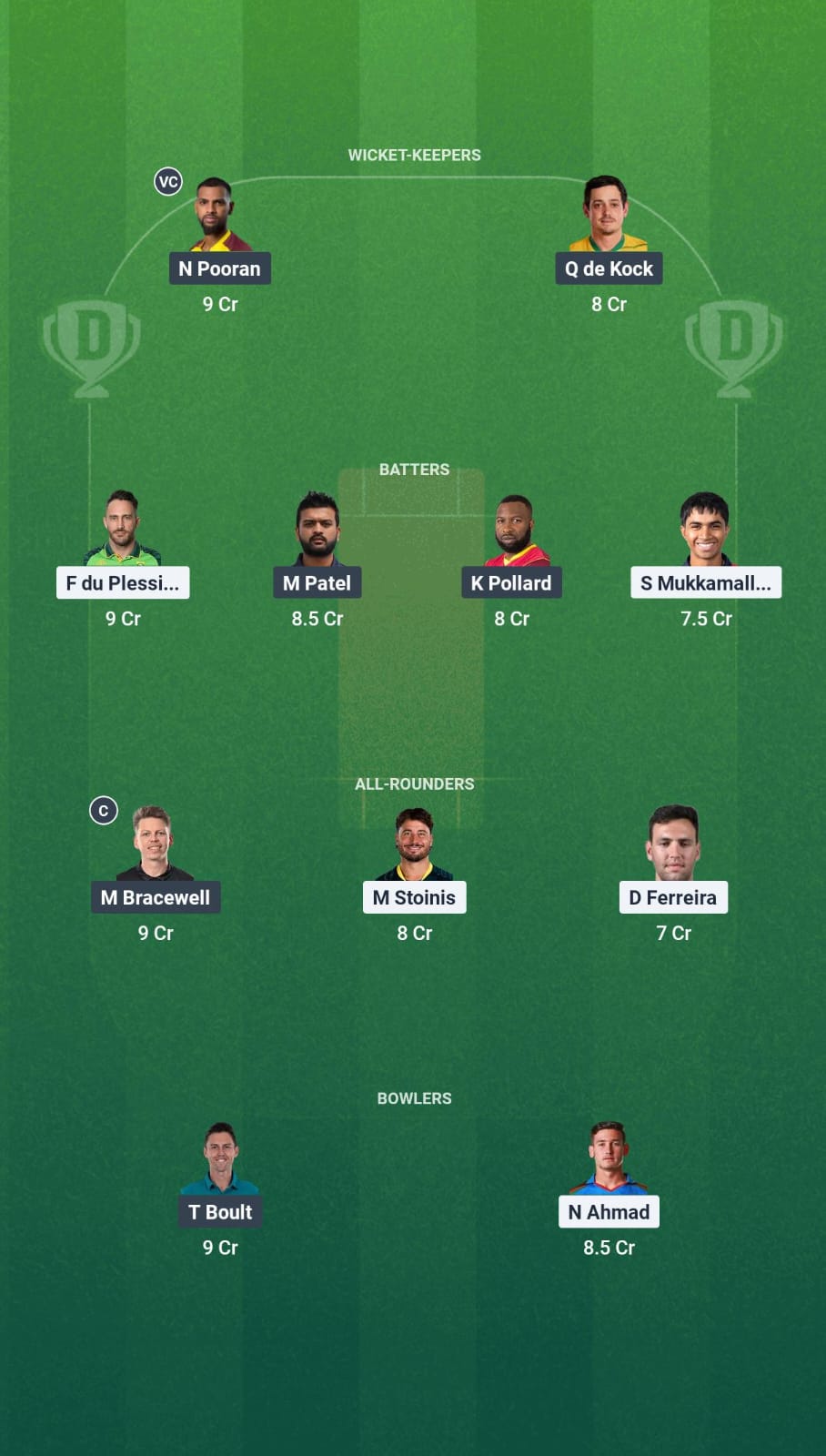 Monank Patel is the top choice here as he has been pretty consistent. We are also going with Kieron Pollard and Faf du Plessis given their vast experience.