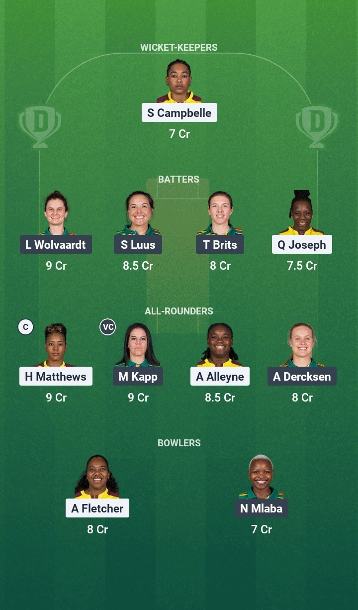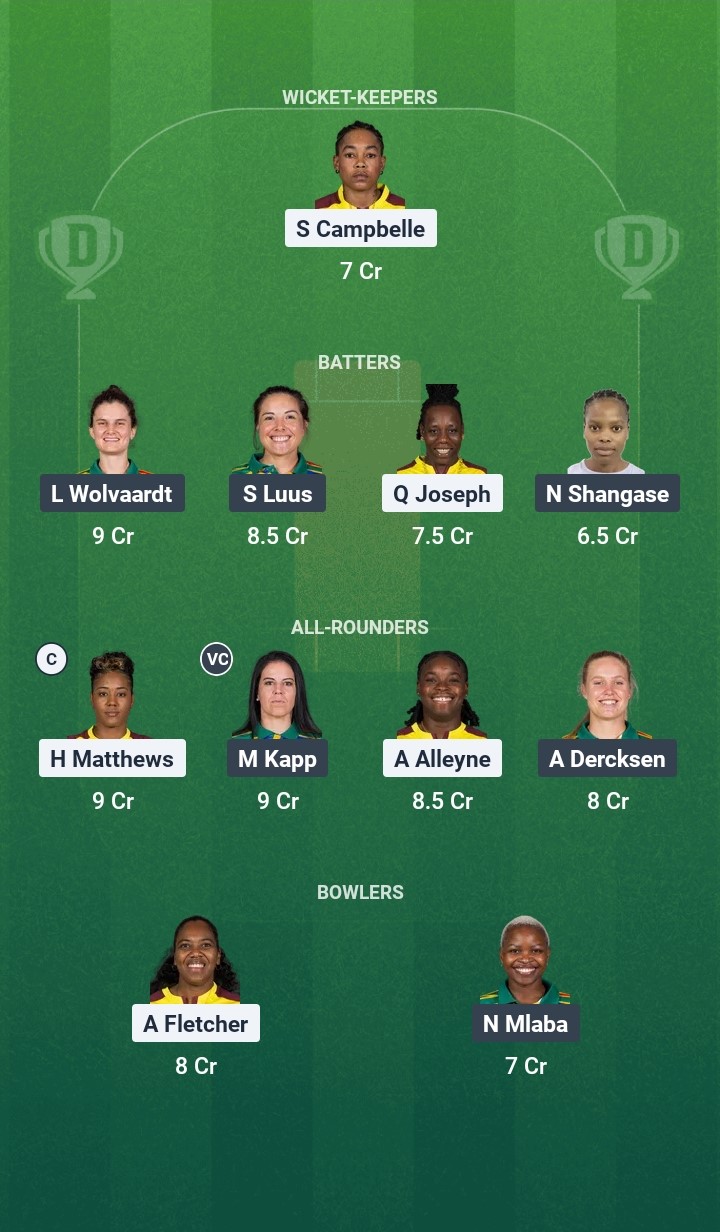 The best all-rounders playing in this contest are the West Indies skipper Hayley Matthews, Marizanne Kapp, and Nadine de Klerk. Some other good ones are Chloe Tryon, Aaliyah Alleyne, Annerie Dercksen, and Chinelle Henry.