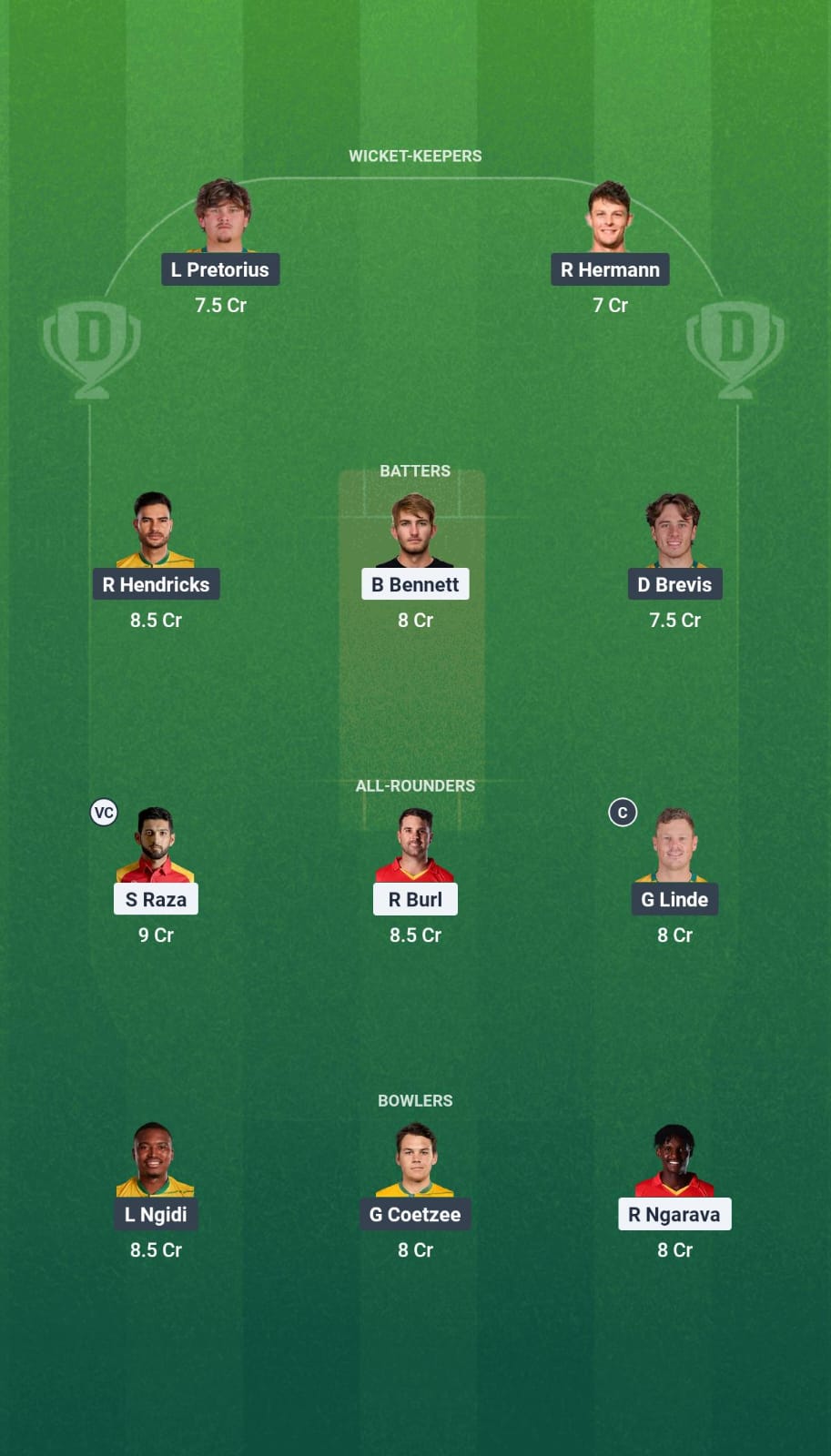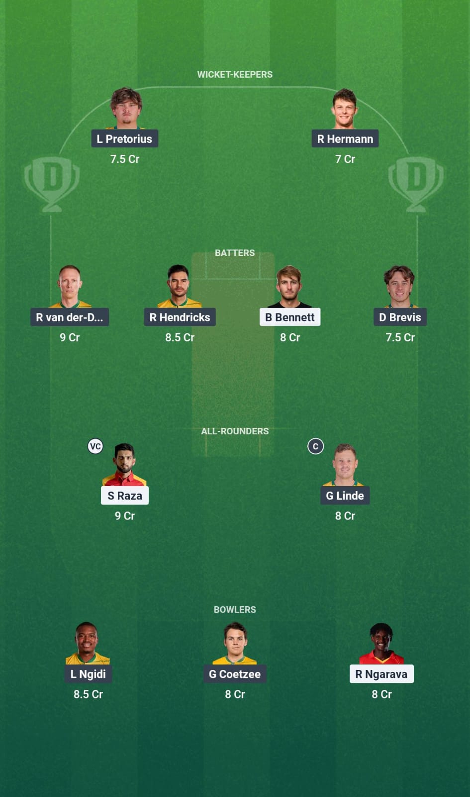 Reeza Hendricks, Lhuan-dre Pretorius (WK), Rassie van der Dussen (C), Rubin Hermann, Dewald Brevis, George Linde, Senuran Muthusamy, Corbin Bosch, Gerald Coetzee, Lungi Ngidi, Kwena Maphaka